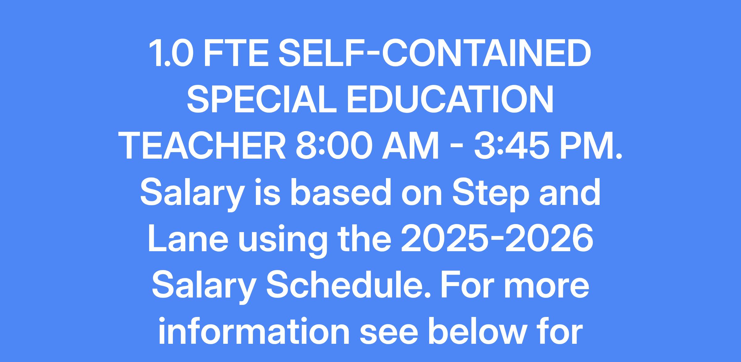1.0 FTE SELF-CONTAINED SPECIAL EDUCATION TEACHER 8:00 AM - 3:45 PM. Salary is based on Step and Lane using the 2025-2026 Salary Schedule. For more information see below for salary link