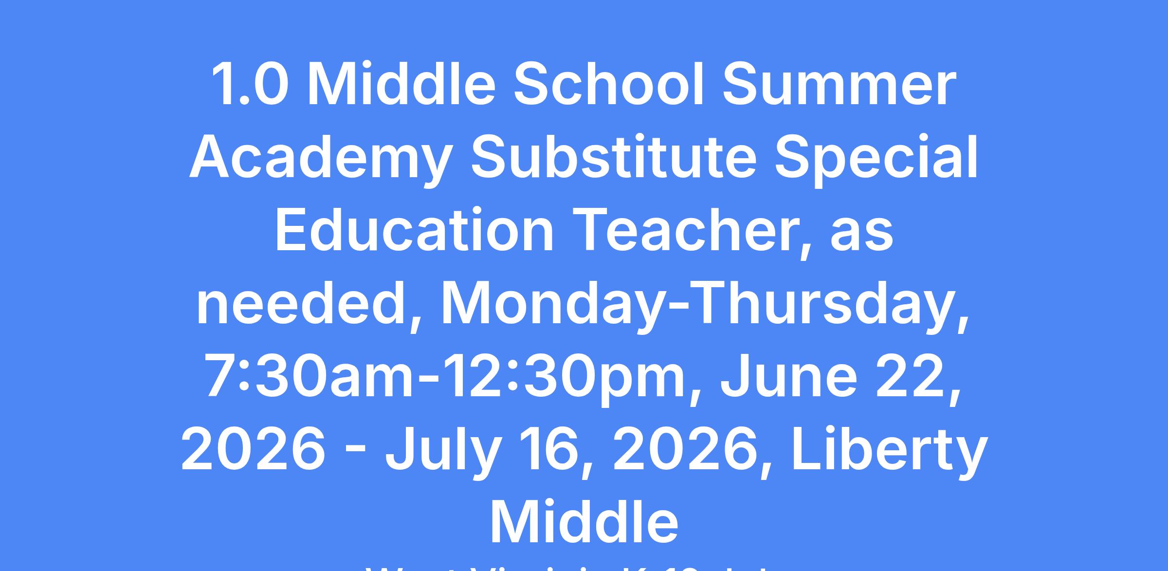 1.0 Middle School Summer Academy Substitute Special Education Teacher, as needed, Monday-Thursday, 7:30am-12:30pm, June 22, 2026 - July 16, 2026, Liberty Middle