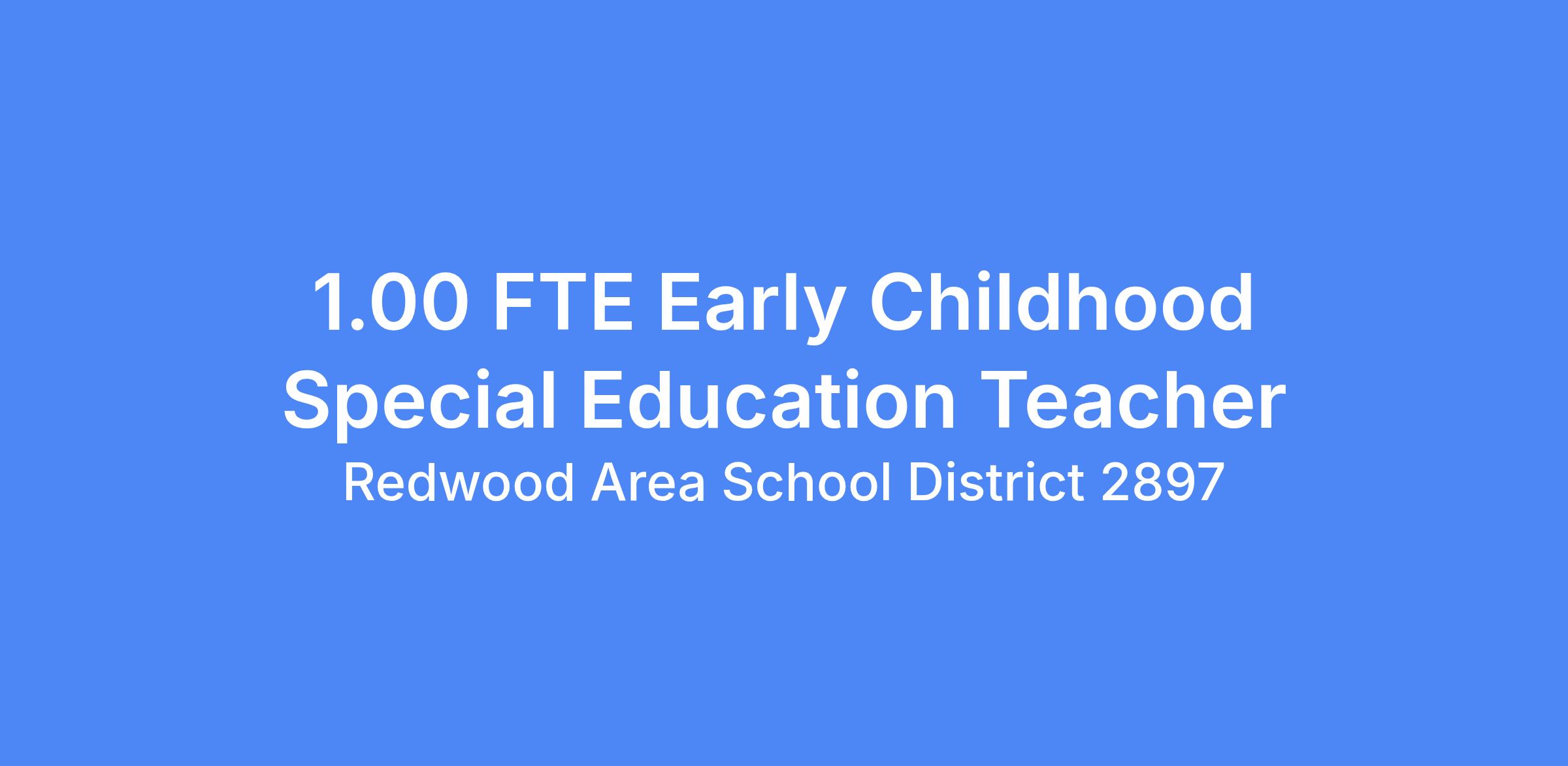 1.00 FTE Early Childhood Special Education Teacher � Redwood Area School District is seeking applications for a full-time Early Childhood Special Education Teacher for the 2026-2027 school year. Wage for this position is $48,000. Application deadline is June 15, 2025. EOE