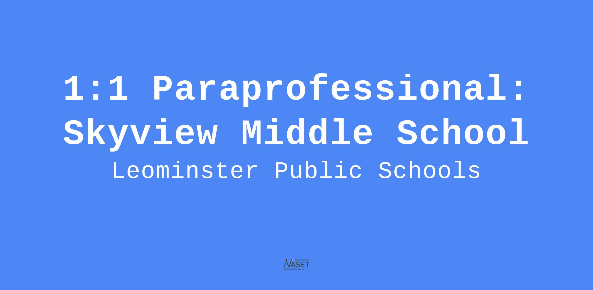 Leominster Public Schools is seeking a 1:1 paraprofessional to assist the student in the classroom with all instructional materials as determined by the assigned teacher and help the student with needs outside of the classroom but related to achieving needed skills and requirements for succeeding in school.