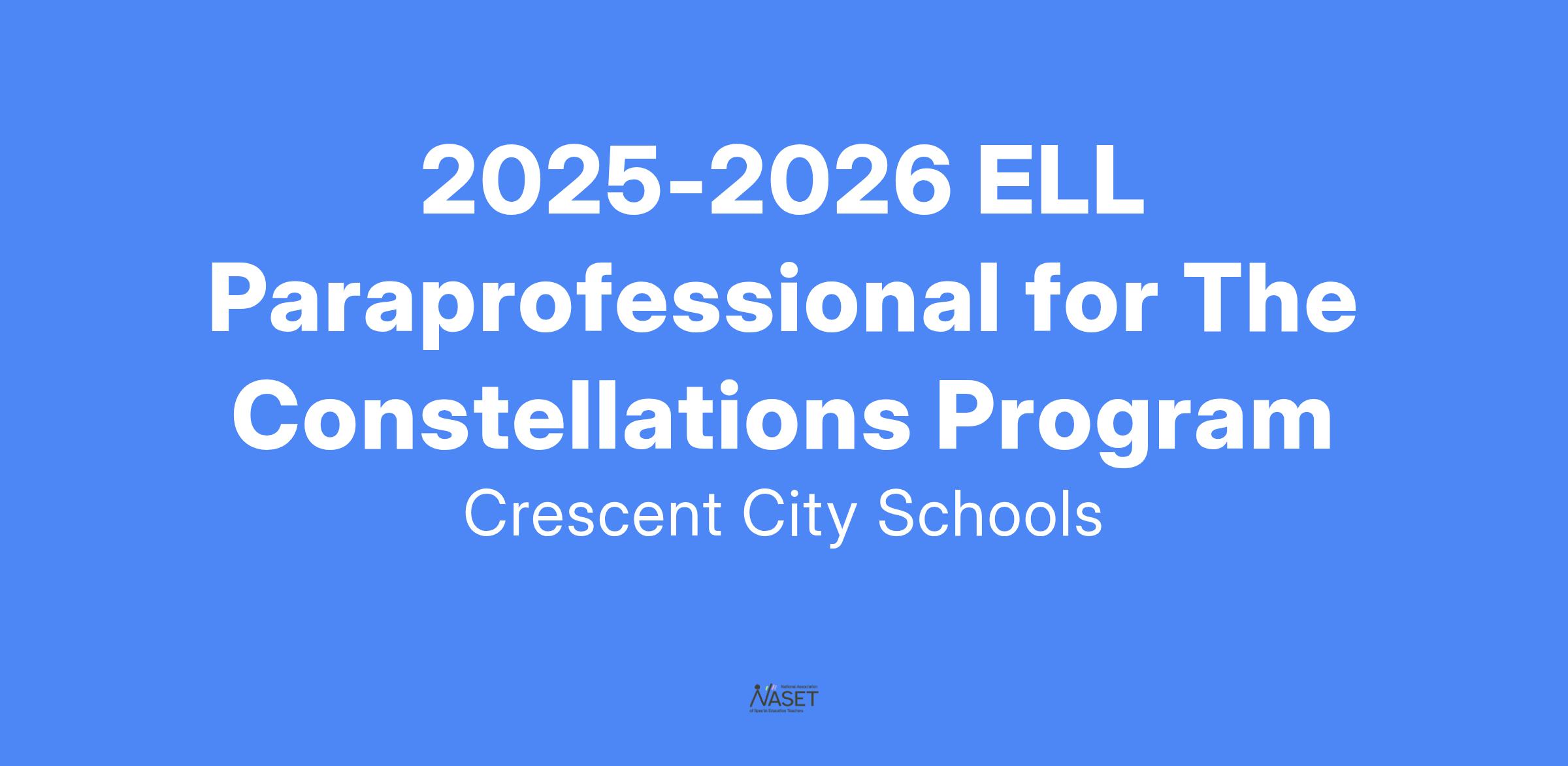 Crescent City Schools is seeking a full-time, well-qualified Paraprofessional. Duties include: supporting students with disabilities in the classroom, delivering instruction individually or in small groups, collecting data and supporting the emotional, social, and behavioral needs of students, and participating in the life of the school as a significant member of the staff. The Constellations Program’s paraprofessional will report to the Principal of the Constellation Program.