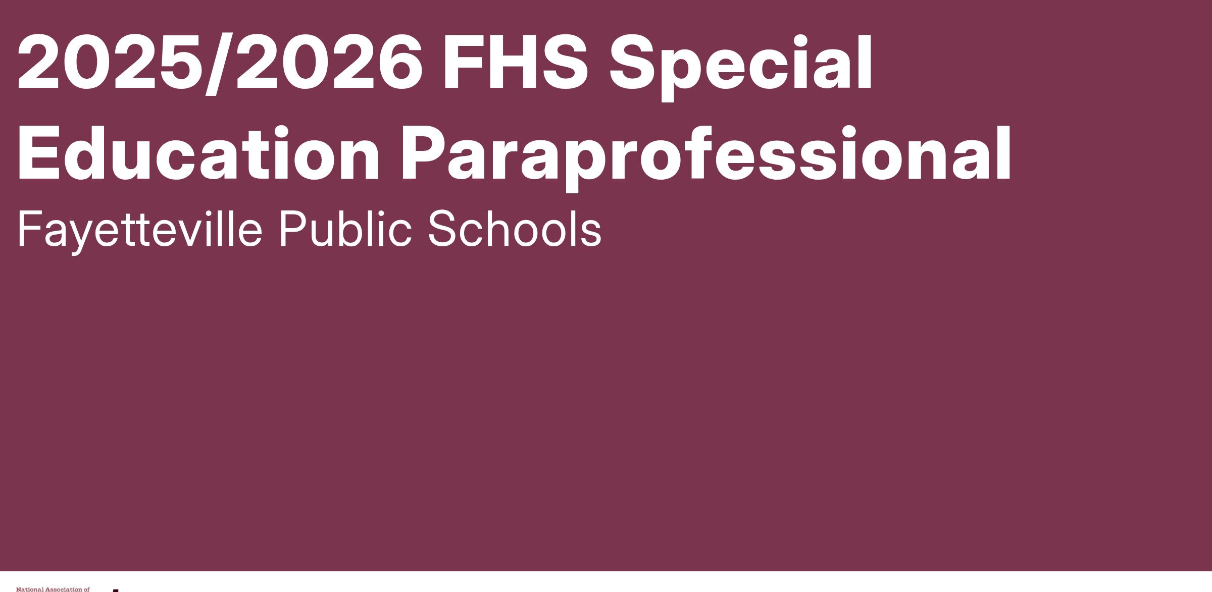Fayetteville High School is seeking a committed and compassionate Paraprofessional to support students in a Structured Learning Services environment (1:15 setting). This role involves assisting with academic instruction, adaptive behavior and daily living skills for students with disabilities. Minimum qualifications include: at least 60 college credit hours, OR a passing score on the Paraprofessional PRAXIS exam. Applicants should also have experience working with students with disabilities, strong communication, collaboration, and problem-solving skills, and the ability to follow teacher direction and provide consistent support in a structured setting. This is a 180 day contracted position.
