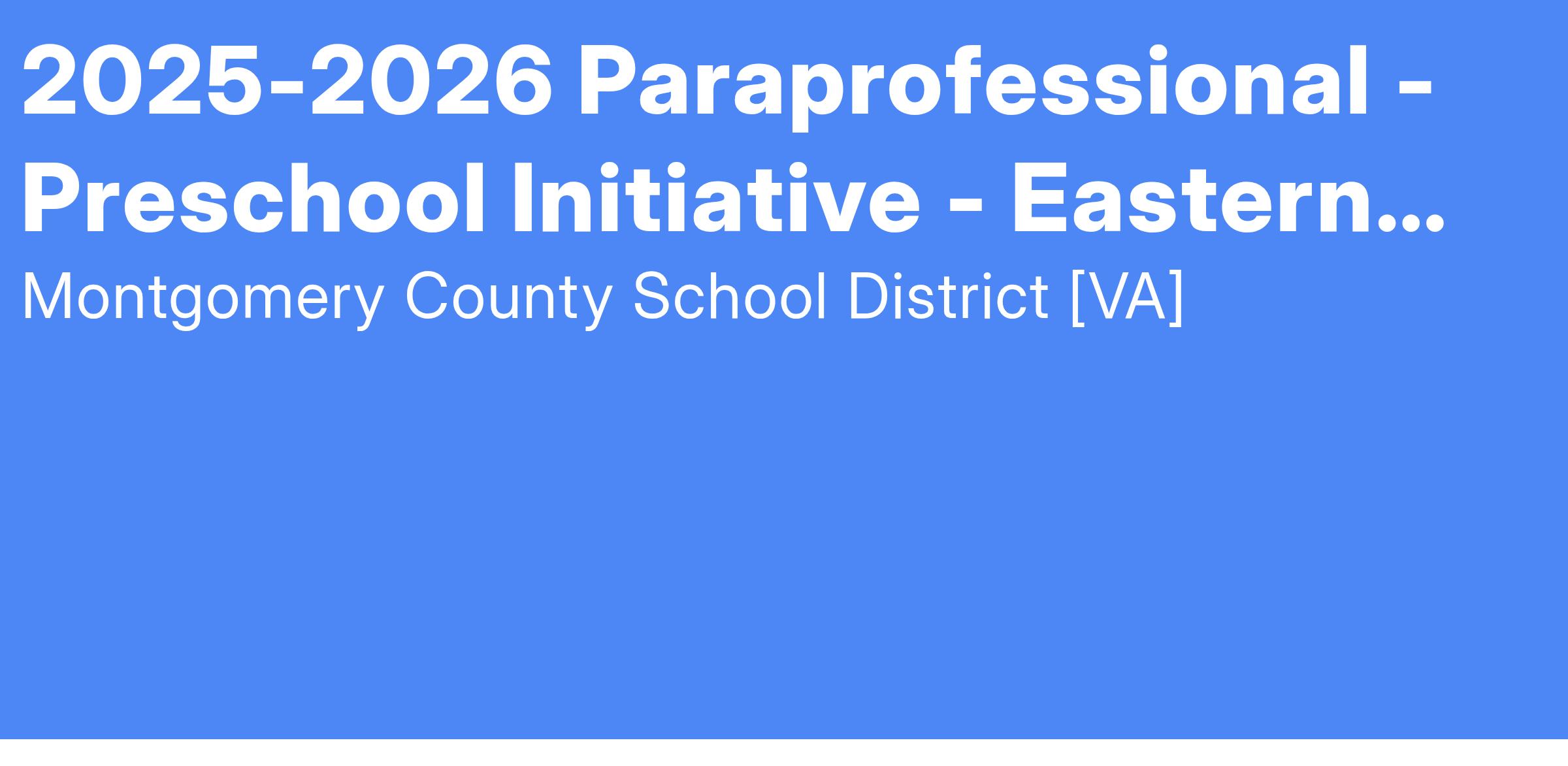 The Montgomery County School Board, Virginia, is now accepting applications for a Paraprofessional - Preschool Initiative position that is available at Eastern Montgomery Elementary School for the 2025-2026 school year. This is a 7.5 hour/day position.
