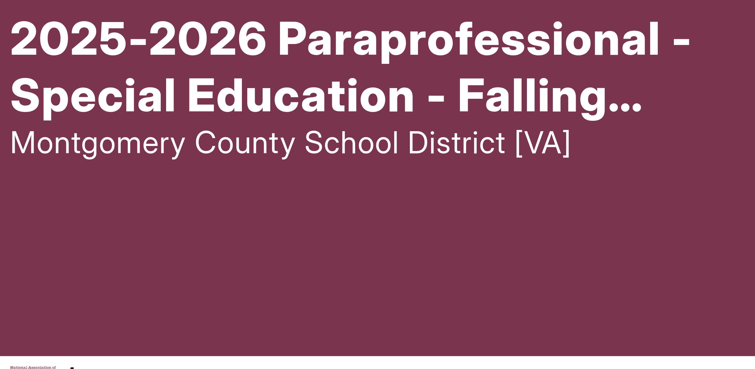 The Montgomery County School Board, Virginia, is now accepting applications for a Special Education Paraprofessional position that is available at Falling Branch Elementary for the 2025-2026 School Year.