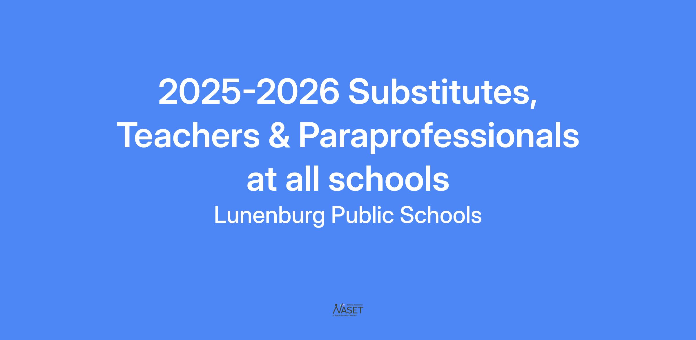 Thank you for considering serving as a substitute in the Lunenburg Public Schools--our administrative team strives to maintain a substitute pool of dedicated individuals. In order to reduce paper consumption LPS only accepts applications processed through SchoolSpring. While applicants with post-high school degrees are preferred, post-high school degrees are not required for per diem substitute assignments.