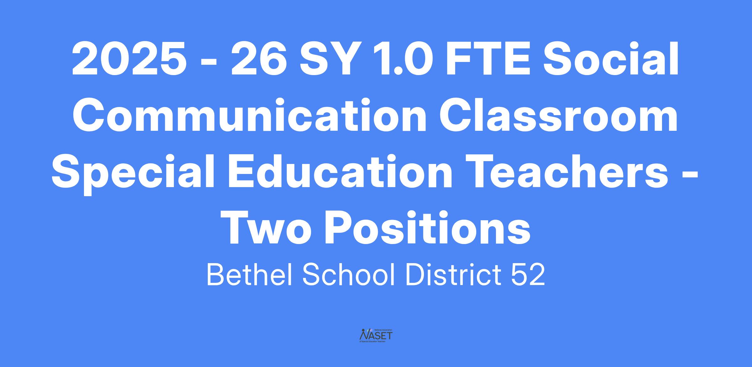 Bethel School District is seeking appropriately licensed candidates for a Two 1.0 FTE Social Communication Classroom (SCC) Special Education Teacher for the 2025-26 school year. Current open positions are: