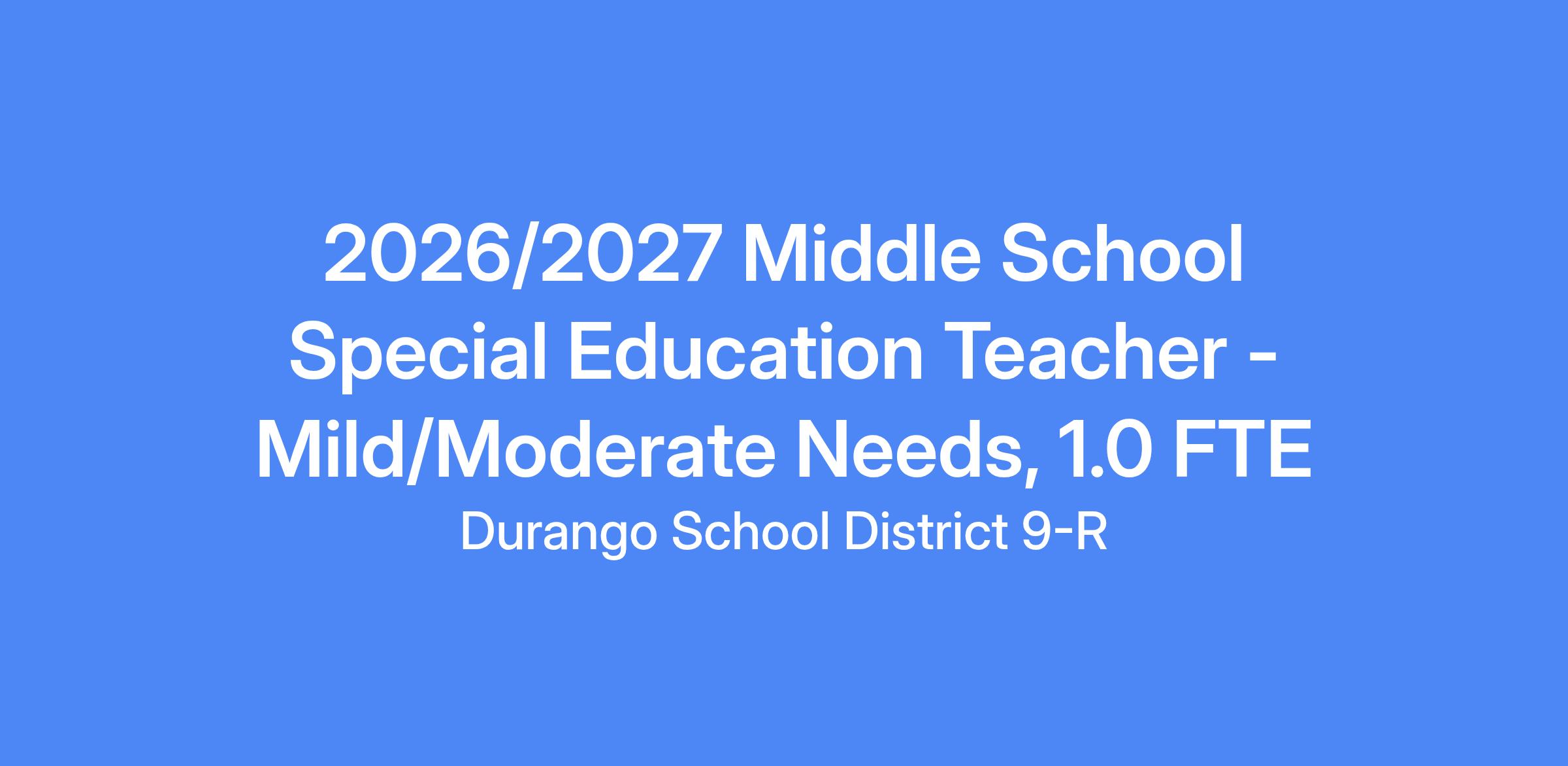 Applications are being accepted for Middle School Mild/Moderate Needs Special Education Teachers for the 2026/2027 school year. Must meet CDE and ESSA's requirements for In-Field Teacher in Special Education by the start date. Begins August 13, 2026.