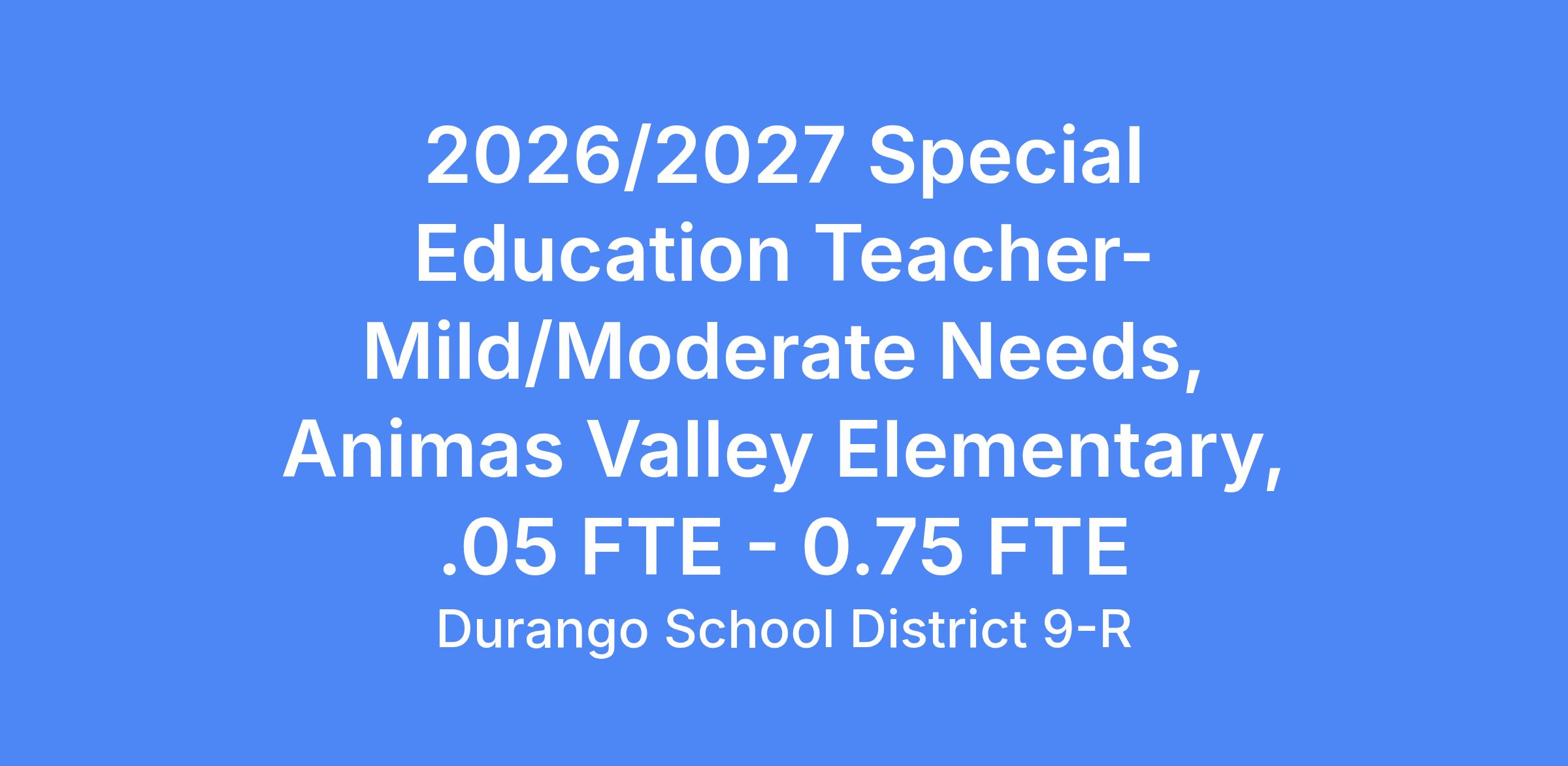 Durango School District is accepting applications for a .5 FTE - .75 FTE (20 - 30 hrs/week) Elementary School Mild/Moderate Needs Special Education Teacher at Animas Valley Elementary School, for the 2026/2027 school year. Must meet CDE and ESSA's requirements for In-Field Teacher in Special Education by the start date. Begins August 17, 2026.