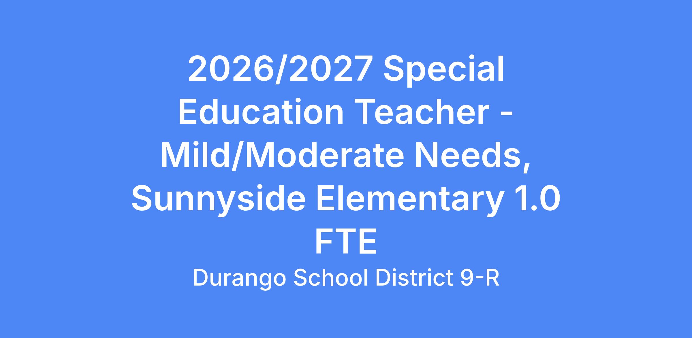 Durango School District is accepting applications for a Mild/Moderate Needs Special Education Teacher to join the team at Sunnyside Elementary for the 2026/2027 school year. Must meet CDE and ESSA's requirements for In-Field Teacher in Special Education by the start date. Begins August 17, 2026