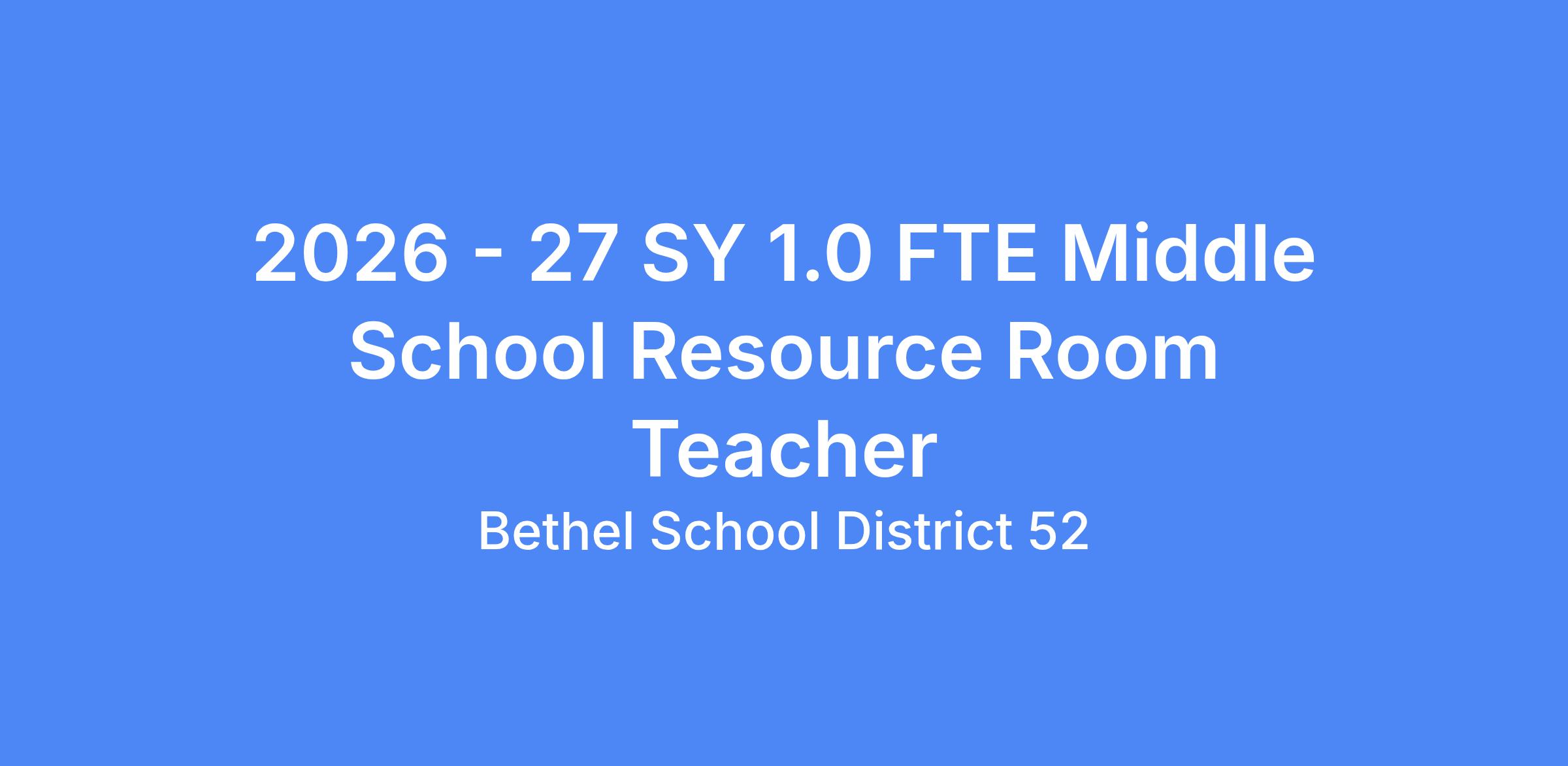 Bethel School District is seeking appropriately licensed candidates for a 1.0 FTE Middle School Resource Room Teacher for the 2026-2027 school year. Location to be determined.