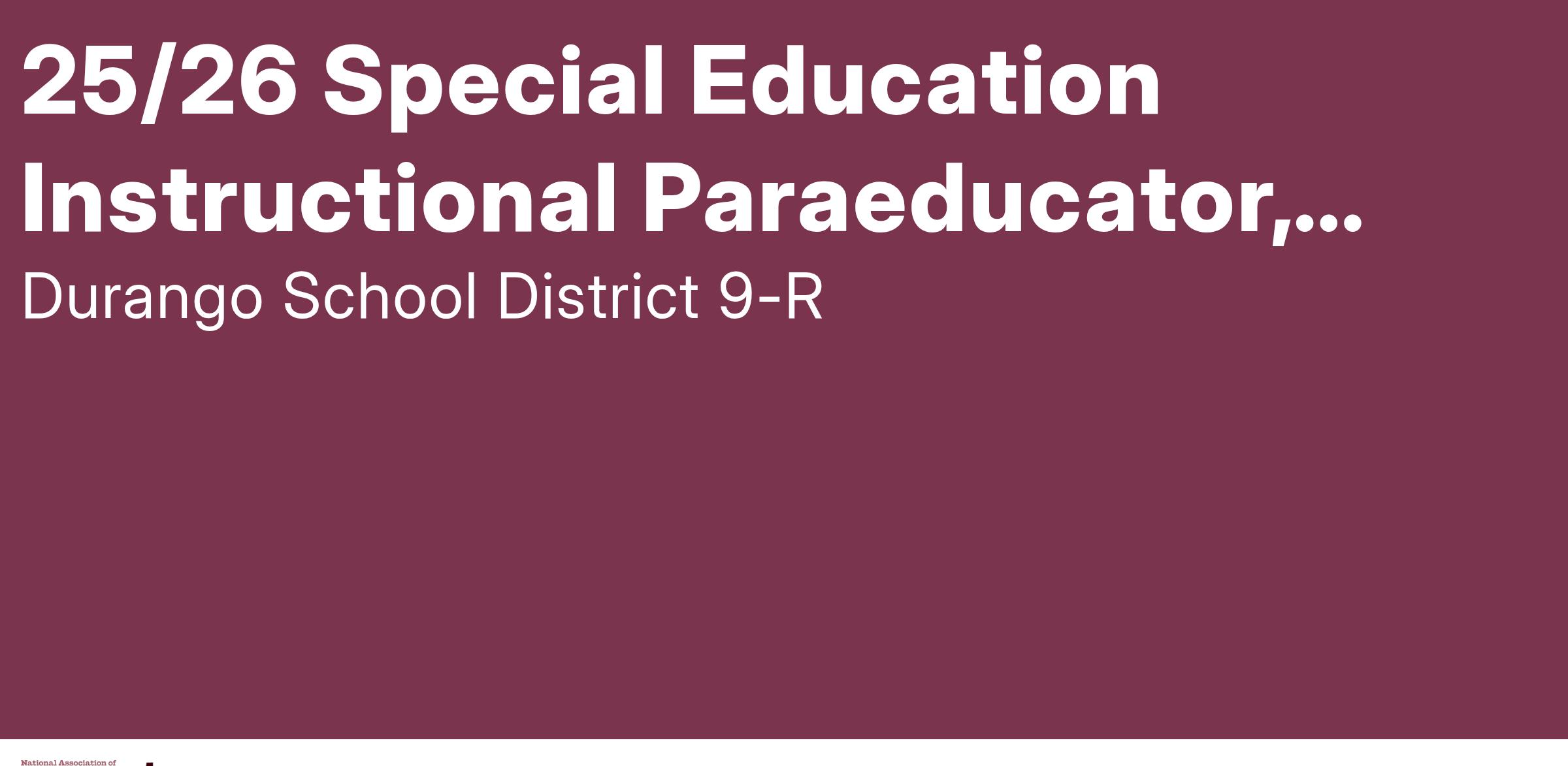 Durango School District 9-R is accepting applications for a Special Education Instructional Paraeducator to work with supporting students in the classroom at Escalante Middle School, 40 hrs/week, Monday- Friday. Includes benefits. Begins August 11, 2025.