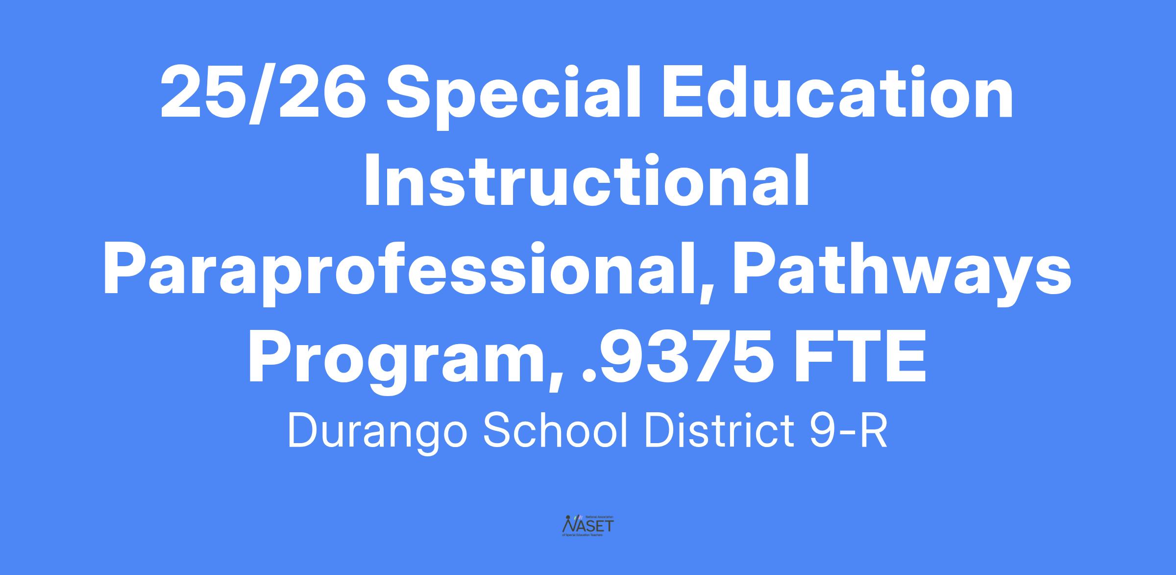 Durango School District 9-R is accepting applications for a Special Education Instructional Paraprofessional in the Pathways Program. The Pathways Program serves students who are 18- 21 years of age in our community based Pathways to Independence Program. Must have experience and interest in working with students with various disability types such as: serious emotional disabilities, significant cognitive disabilities, and physical disabilities. Position starts each day at 8:00 am Monday - Friday a total of 37.5 hours per week. This position works with the Pathways Program Monday-Thursday, on Friday this position is based at another school in Durango. Includes full benefits. Begins August 2025.
