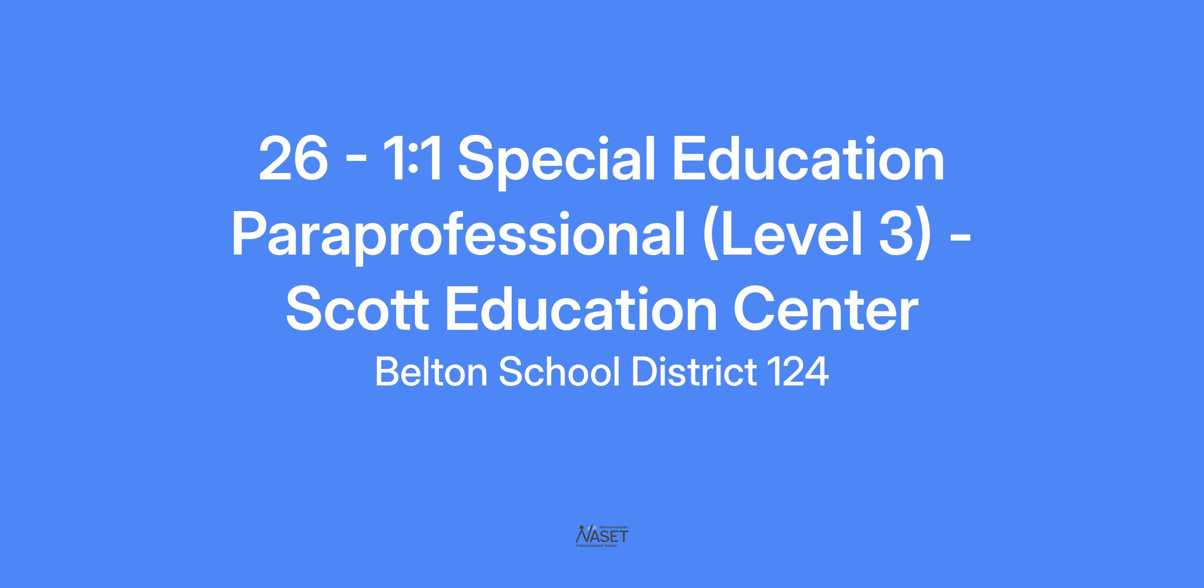 1:1 Special Education Paraprofessional (level 3) needed for the 2025-2026 school year at Scott Education Center Salary range: $18.64/hr - $25.48/hr. (depending on experience)+ full benefits + $786 annual stipend for college credit.