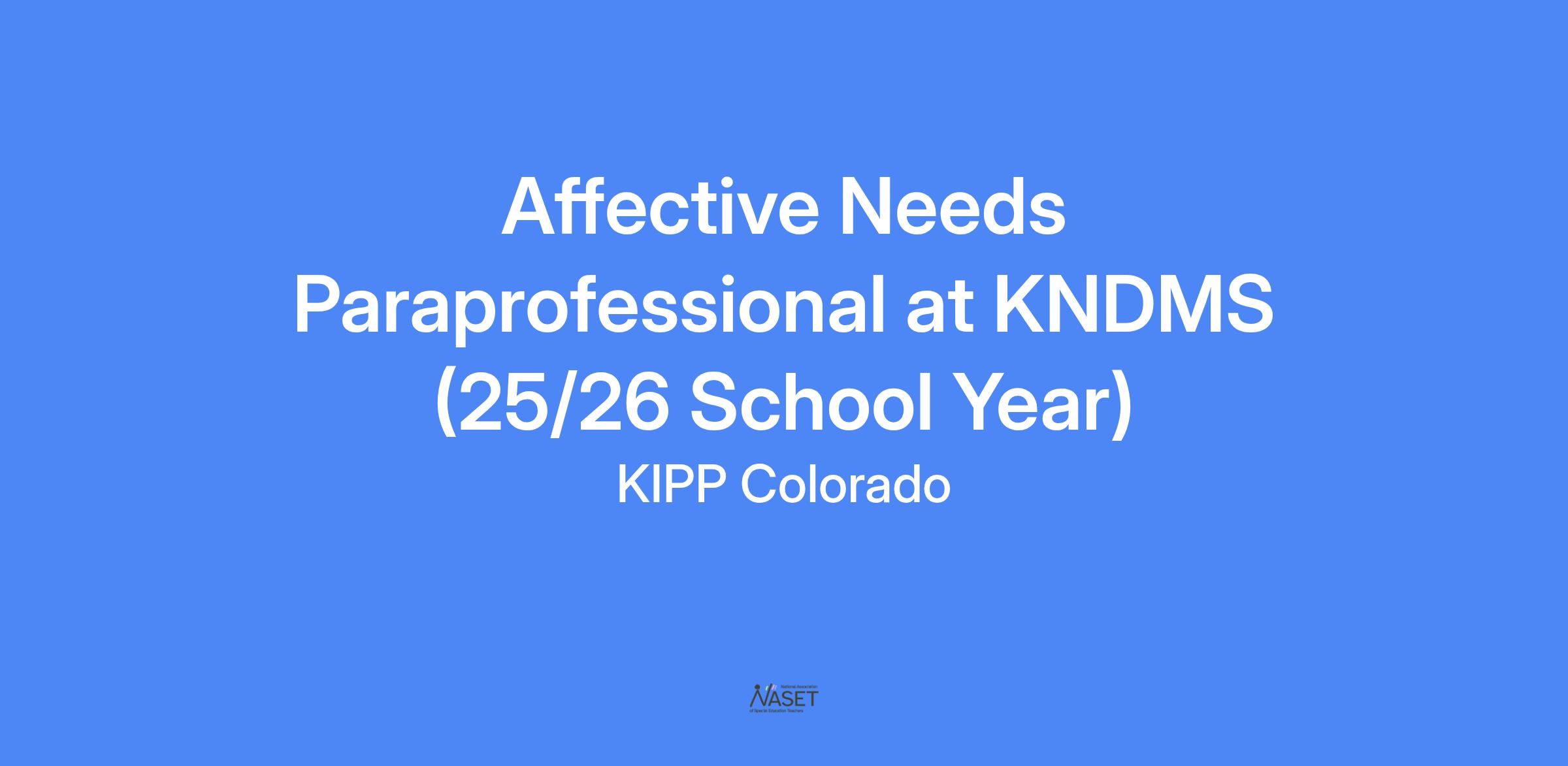 About the Affective Needs Paraprofessional Role: The Affective Needs Paraprofessional will work closely with the Affective Needs Teachers to provide a high level of support for our students with Affective Needs (Emotional and Behavior Disabilities). This position demands someone who has a strong ability to develop relationships with at-risk students, has experience in deescalating students with anger or behavioral issues, and has a desire to teach.