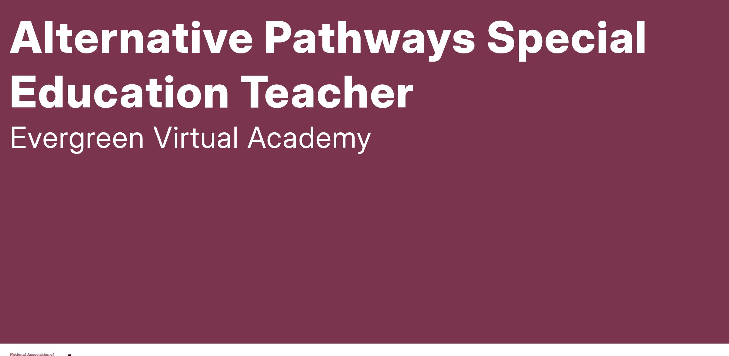 The Alternative Pathways Special Education Teacher is a highly qualified, state certified educator responsible for case management, case oversight, goal tracking, and consultation Specially Designed Instruction in an online environment. Alternative Pathways Special Education Teachers work within the EVA@Home and District Partner models within Evergreen Virtual Academy. In regard to EVA@Home, they conduct intake IEPs, respond to assessment requests, case manage initial assessments, case manage all IEP students, provide consultative SDI with oversight of independent practice, manage goal progress. In regard to the District Partner program, they oversee students with IEPs, provide IEP input and goal progress to districts, communicate with district partners about specific students, ensure staff have access to IEPs, ensure accommodations are being implemented, support teachers in developing modifications. Alternative Pathways Special Education Teachers typically work from home but must travel occasionally throughout the year to various school functions, for state testing and as may be otherwise required by the school.?This is a temporary 2-year position with an opportunity to become permanent. The status of this position will depend on student enrollment maintenance and growth within Alternative Pathways.