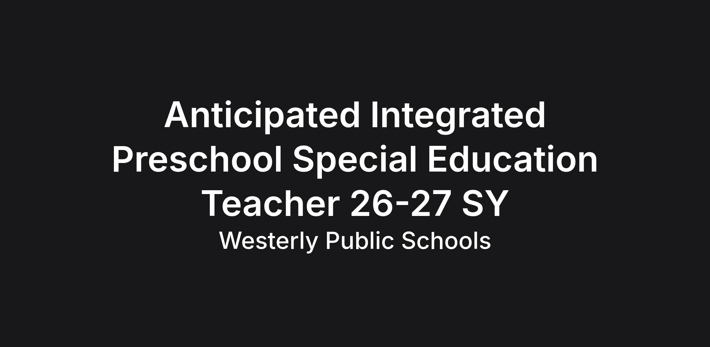 Job Summary: Westerly Public Schools seeks a highly effective preschool dual certified special educator/early childhood teacher to join our Inclusionary Prekindergarten program. The successful candidate will have the skill set to create a safe learning environment where all students are engaged in learning at their readiness level towards RI Early Learning Standards.