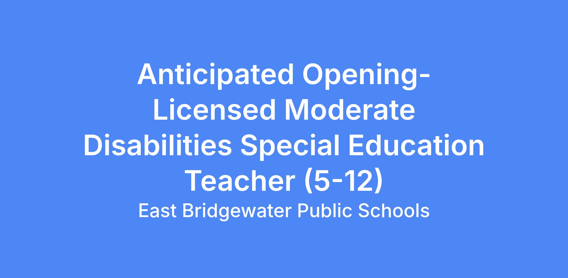 The East Bridgewater Public School District is now accepting applications for a highly qualified special education teacher who is responsible for the instruction, evaluation, coordination and regulatory compliance for special education students in inclusive and small group settings. This position is for the 2026-2027 school year.
