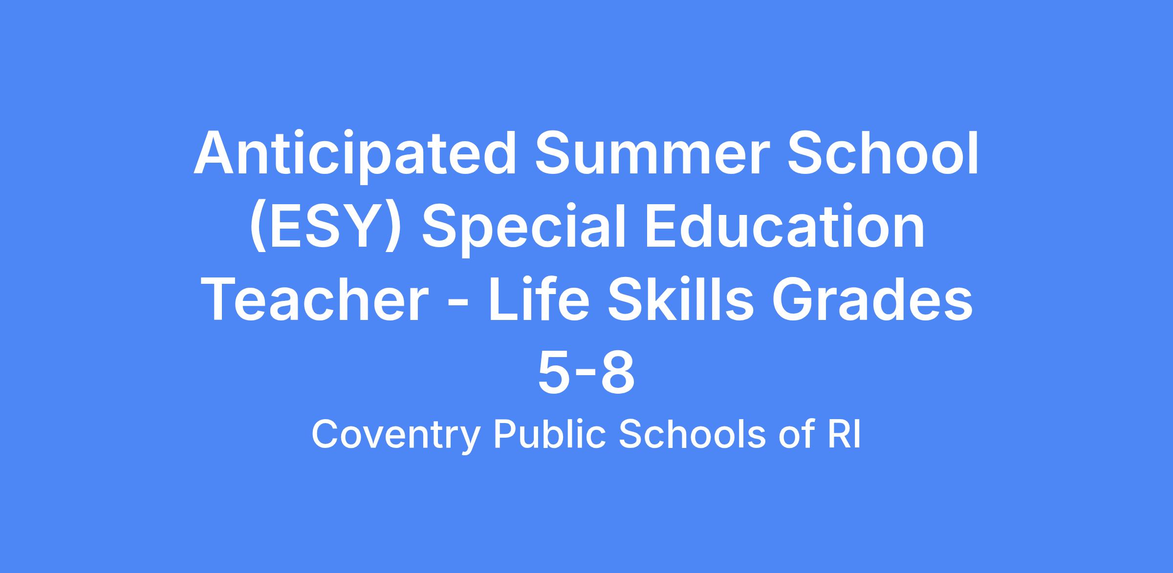 Coventry Public Schools is seeking to hire a Summer School (ESY) Special Education Teacher for Life Skills Grades 5-8