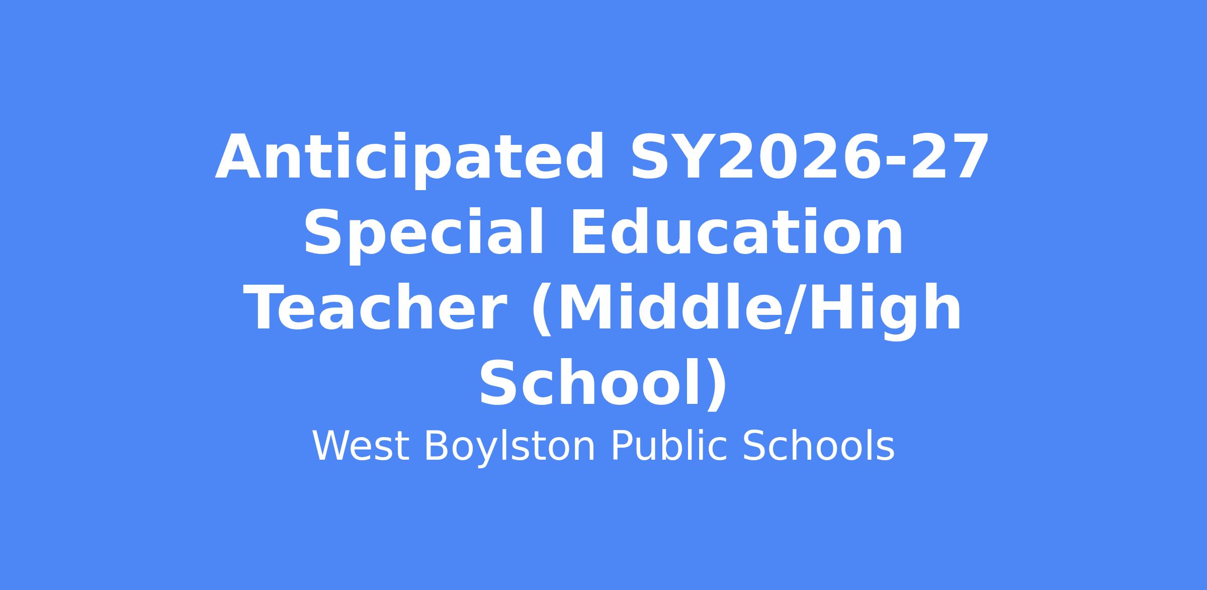 West Boylston Public Schools is seeking a Middle/High School Special Education Teacher to provide specialized instruction and support to students with disabilities in grades 5–12. This role focuses on ensuring access to the general education curriculum, supporting academic achievement, and fostering independence through inclusive practices, co-teaching, and targeted interventions.