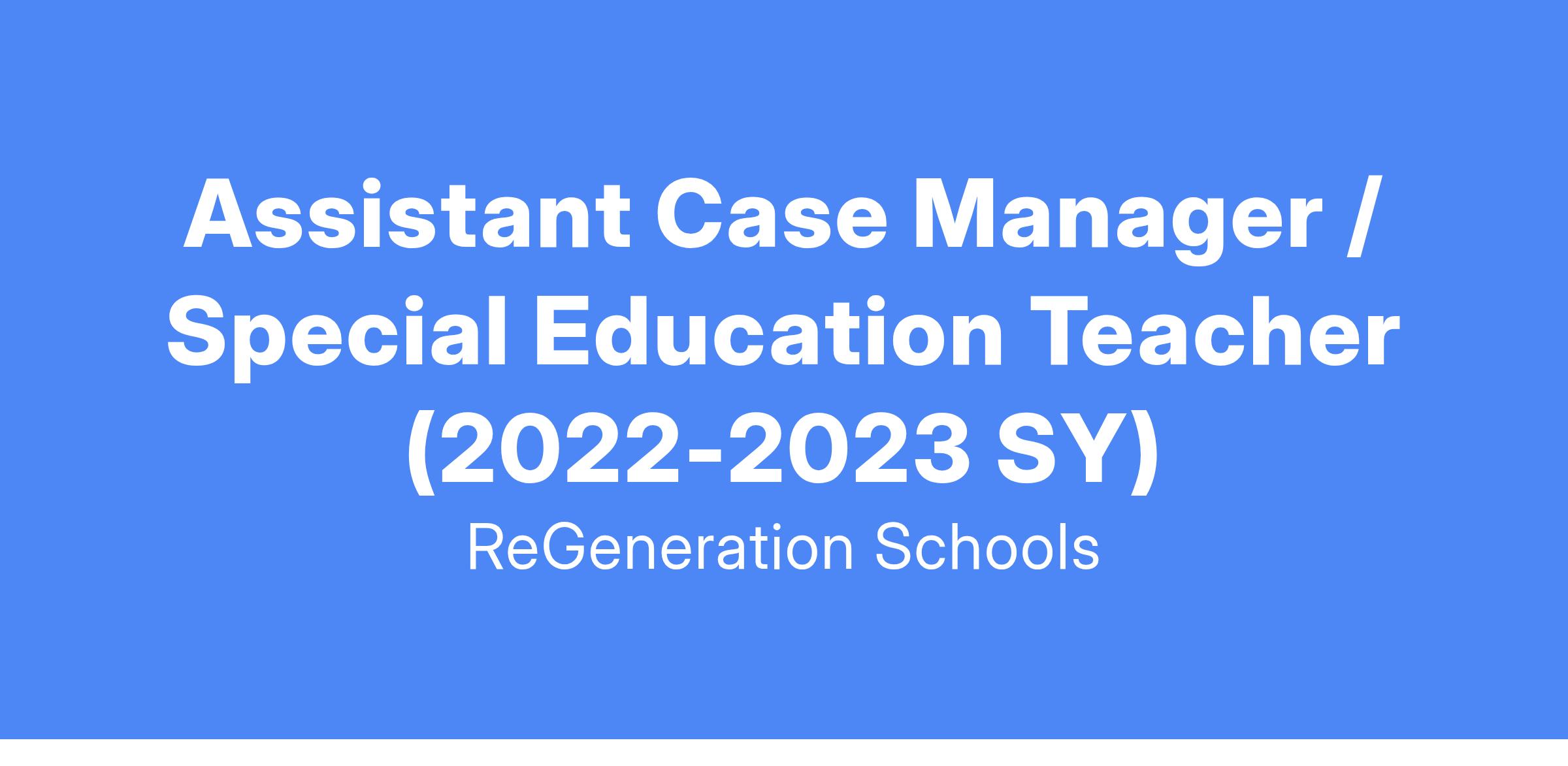 ReGeneration Schools seeks highly organized and motivated Assistant Case Manager/Special Education Teacher to join our campuses. Reporting to the School Principal and Director of Specialized Services, the Asst. Case Manager plays a critical role in building a rigorous education for students with disabilities that maintains and goes beyond compliance. The Asst. Case Manager works with the school-based Specialized Services Team to ensure that effective Individualized Education Plans are created and implemented to ensure student achievement. The Asst. Case Manager serves as a resource for school staff regarding special education best practices, works closely with students and their families to ensure the individual needs of the student are being met, and are responsible for maintaining authentic compliance around State and Federal Law.