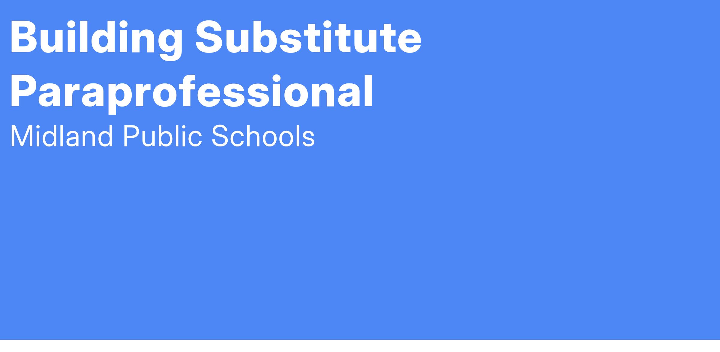 Midland Public Schools has multiple openings for substitute paraprofessional support. Substitute Paraprofessionals are contacted on an as-needed basis to cover absences reported by regular hour paraprofessionals. The role of the substitute paraprofessional is to assist teachers with class work and/or assist with the daily care of students.