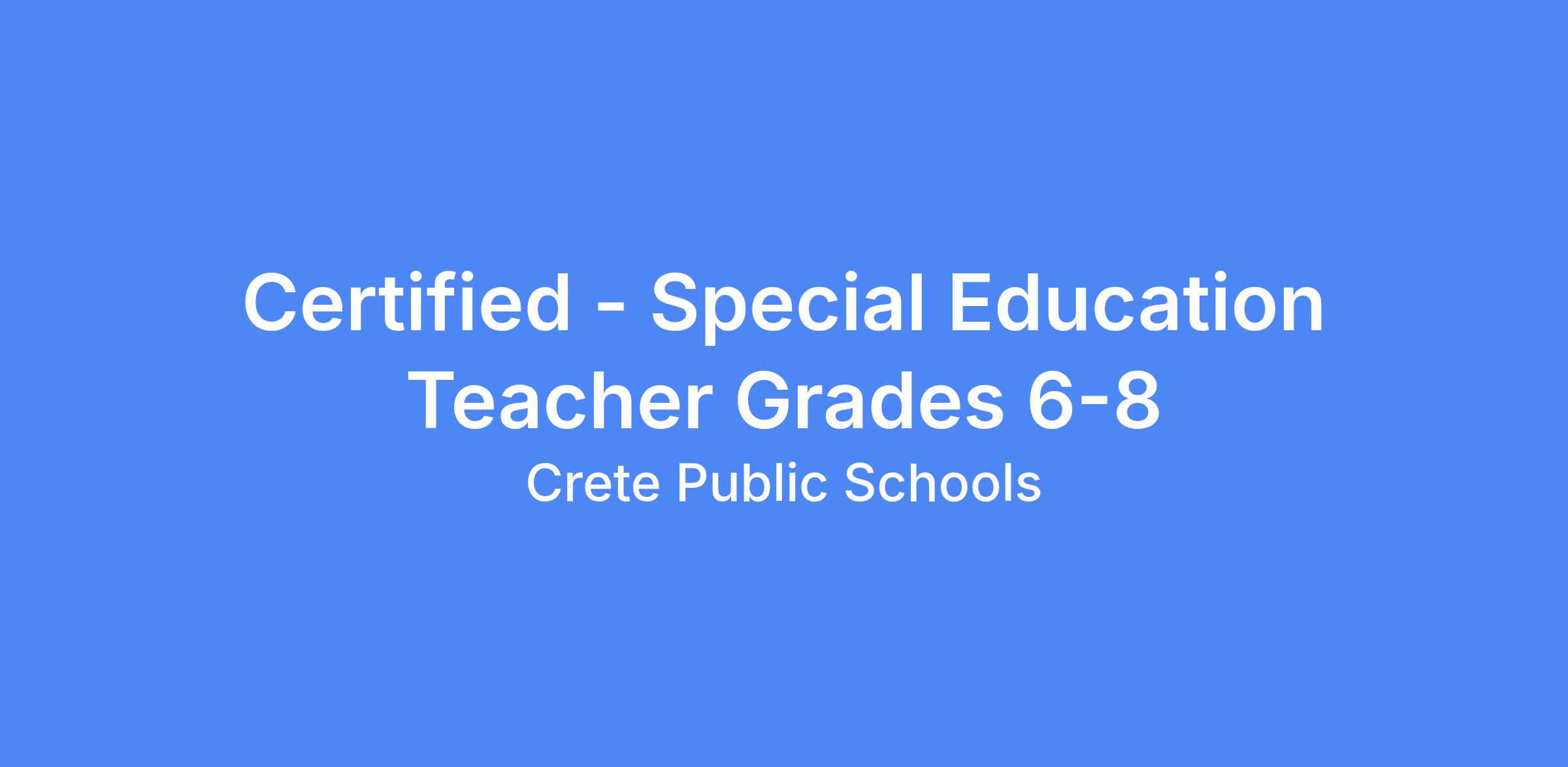 Crete Public Schools is seeking qualified applicants for a Special Education Teacher for grades 6-8 at Crete Middle School for the 2026-2027 school year. Benefits include paid health insurance, long-term disability insurance, and personal and sick leave. This position is open until filled.