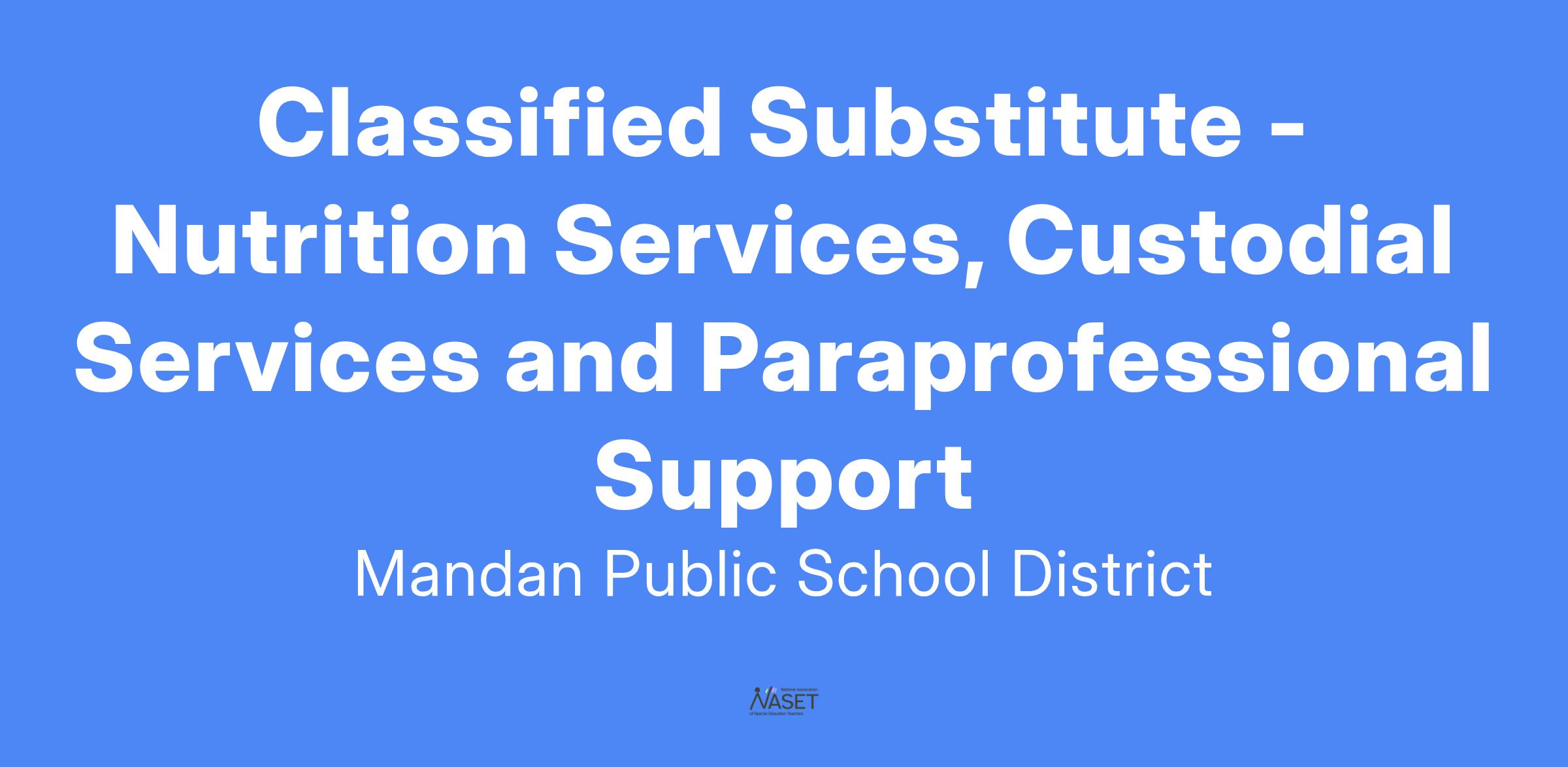 Mandan Public Schools (MPS) is currently hiring Classified Substitutes to support all MPS buildings. We are looking for substitutes in the areas of Nutrition Services, Custodial Services, and Paraprofessional Support.
