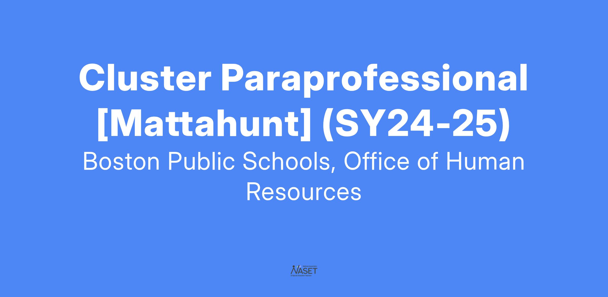 Cluster Paraprofessionals fill short absences created by Classroom Paraprofessionals (e.g. paraprofessionals who work with Kindergarten, Sheltered English Immersion, and Special Education students). The Cluster Paraprofessional will assist the teacher to provide an innovative, high quality education program designed to meet the needs of the children in the Boston Public Schools. Cluster Paraprofessionals will work with school staff to create an educational environment in which quality and continuity are key factors in educating the students of the Boston Public Schools.