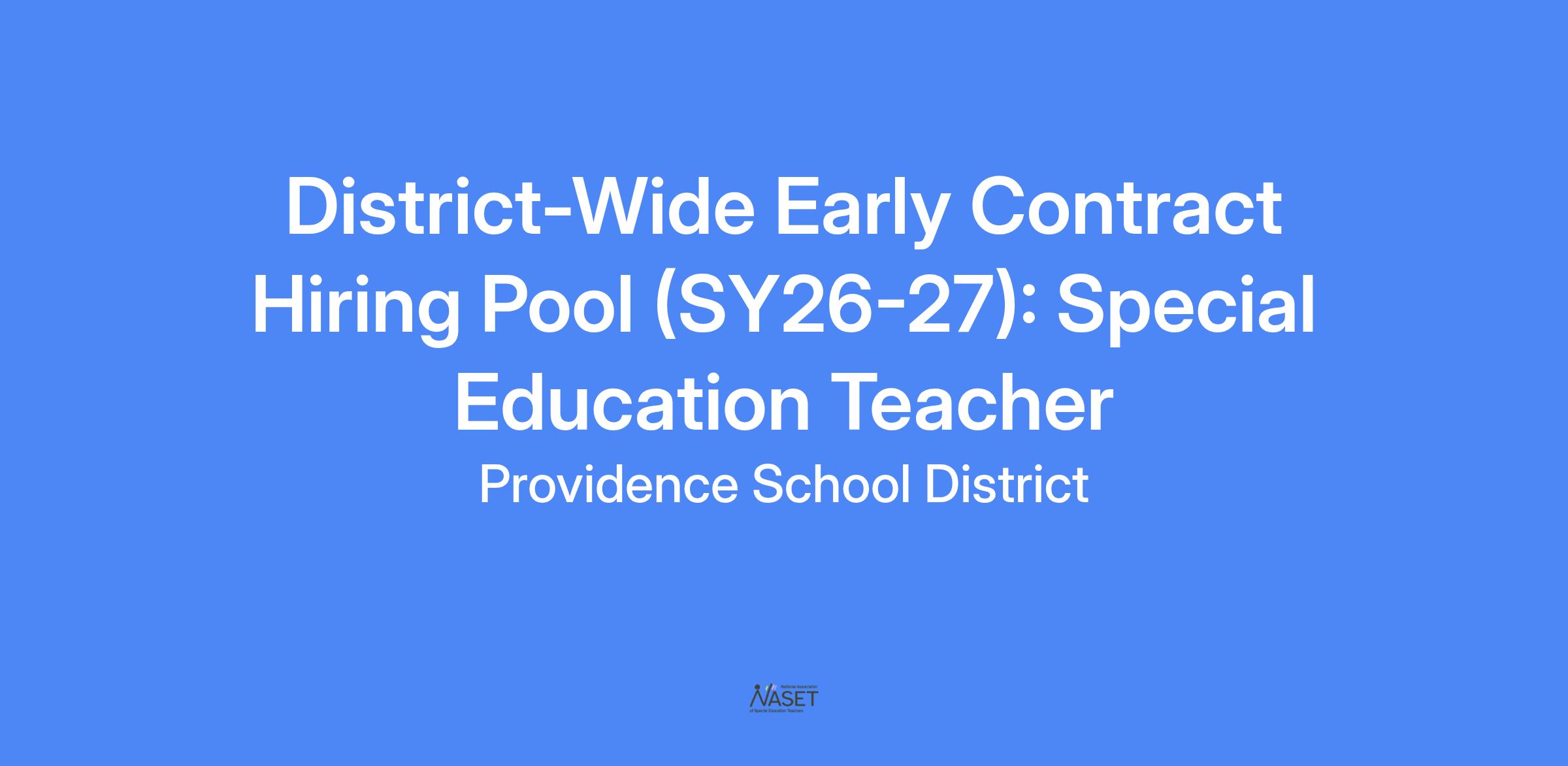 The Providence Public School District (PPSD) seeks individuals interested in Special Education positions for the 2026-2027 school year. By submitting your application to this posting, you will be pre-screened by our Human Resources team and have the opportunity to interview with school-based leaders and district hiring managers. Those who are selected as priority candidates will receive an early hiring contract, contingent on completion of licensure and background check requirements, and will be guaranteed a position in SY26-27. Candidates who receive an Early Hiring Contract must also apply to school-based positions for which they are interested and eligible once they are posted in early March.