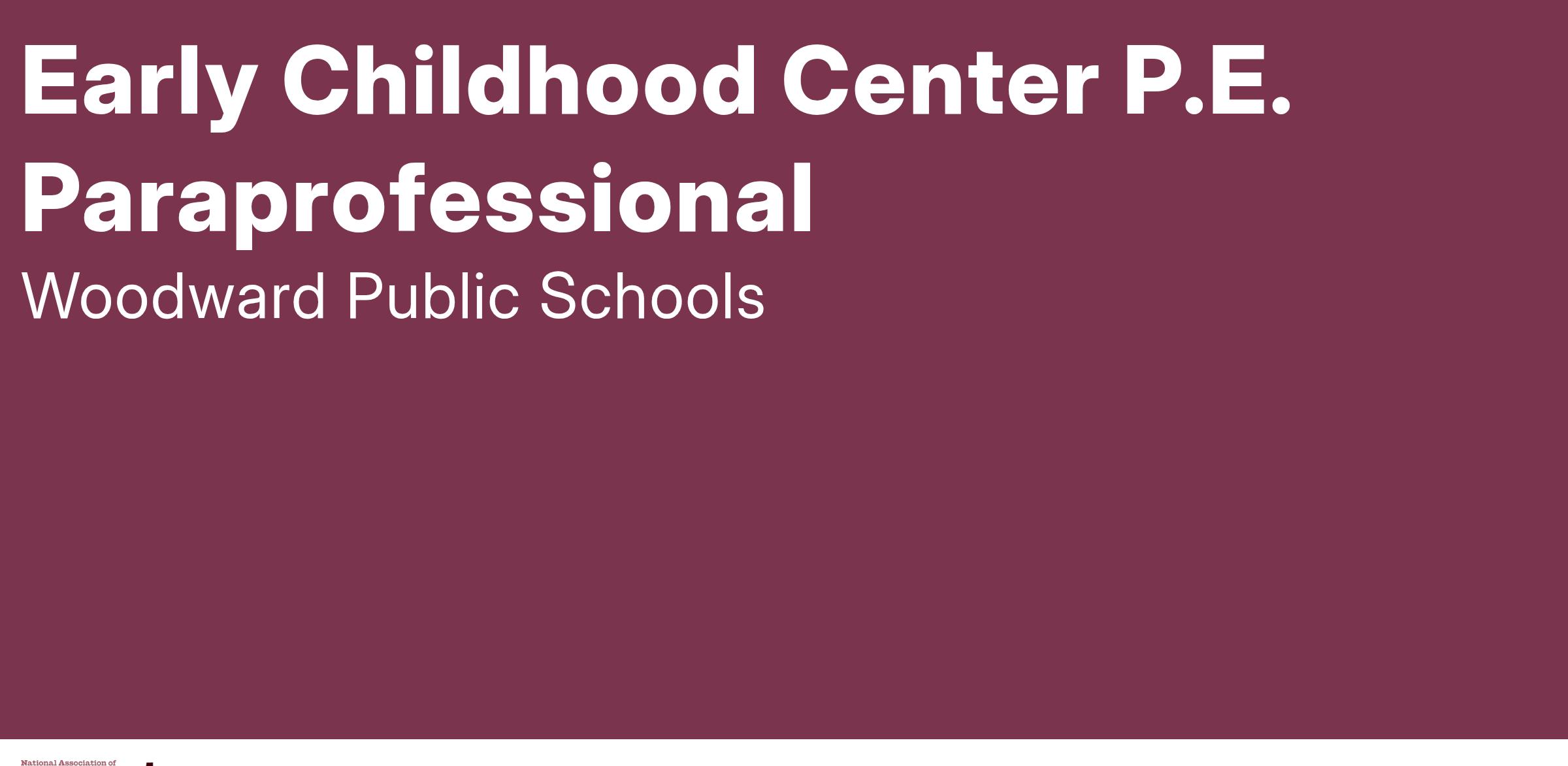 Purpose: The Early Childhood Center P.E. Paraprofessional will assist the assigned teacher(s) in creating a positive learning environment to facilitate the personal, social, and intellectual development of the students. To accomplish these tasks, the P.E. Paraprofessional shall work closely with the staff and administration of the district.