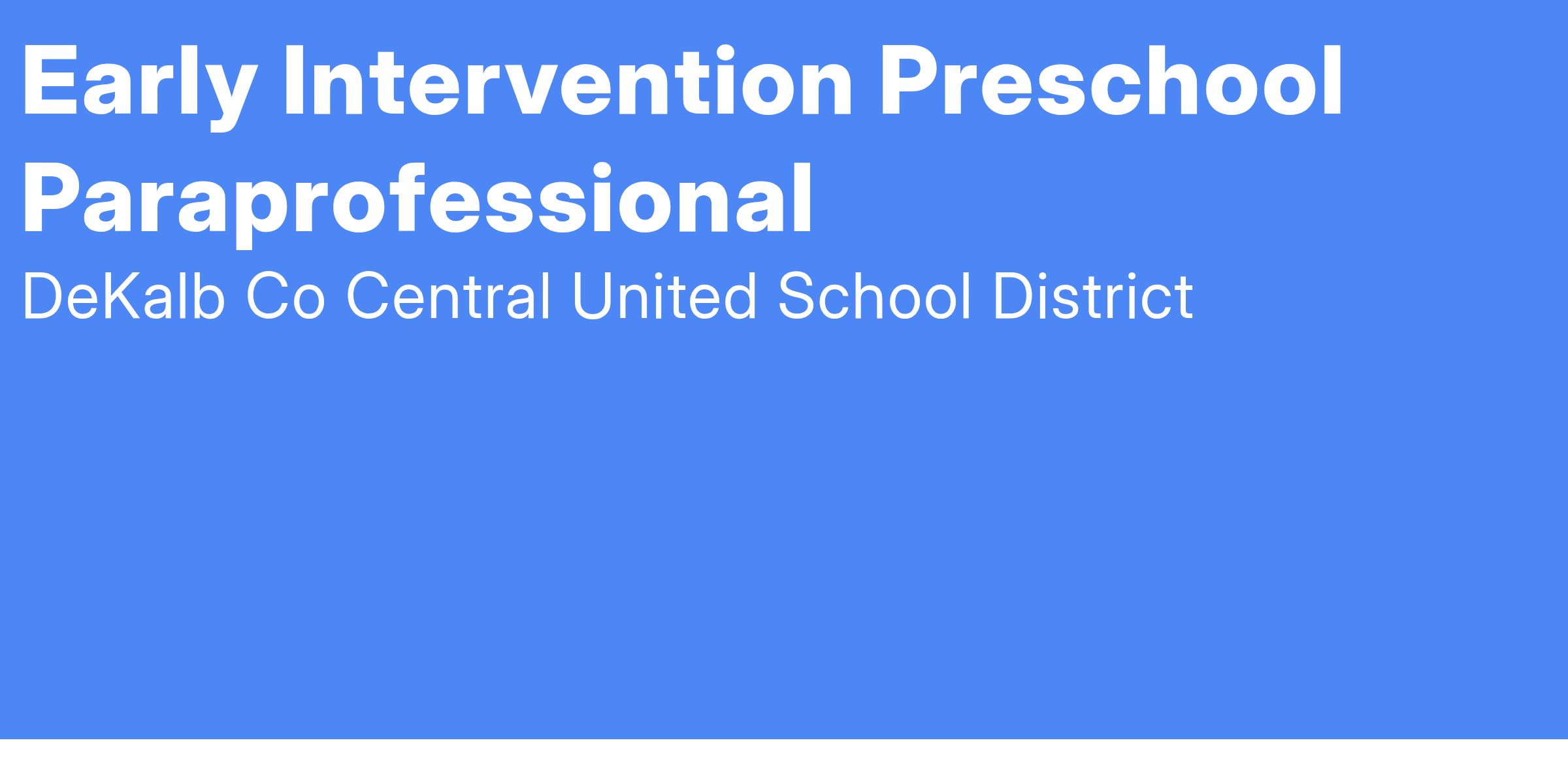 DeKalb County Central United School District is committed to preparing students today for the world of tomorrow. Our mission is to develop students as critical thinkers, communicators, and collaborators who can adapt and persevere with empathy and integrity in an ever-changing world. Every member of our team is a valuable resource in this pursuit of excellence, and we are currently seeking an Early Intervention Preschool Paraprofessional at Country Meadow Elementary!