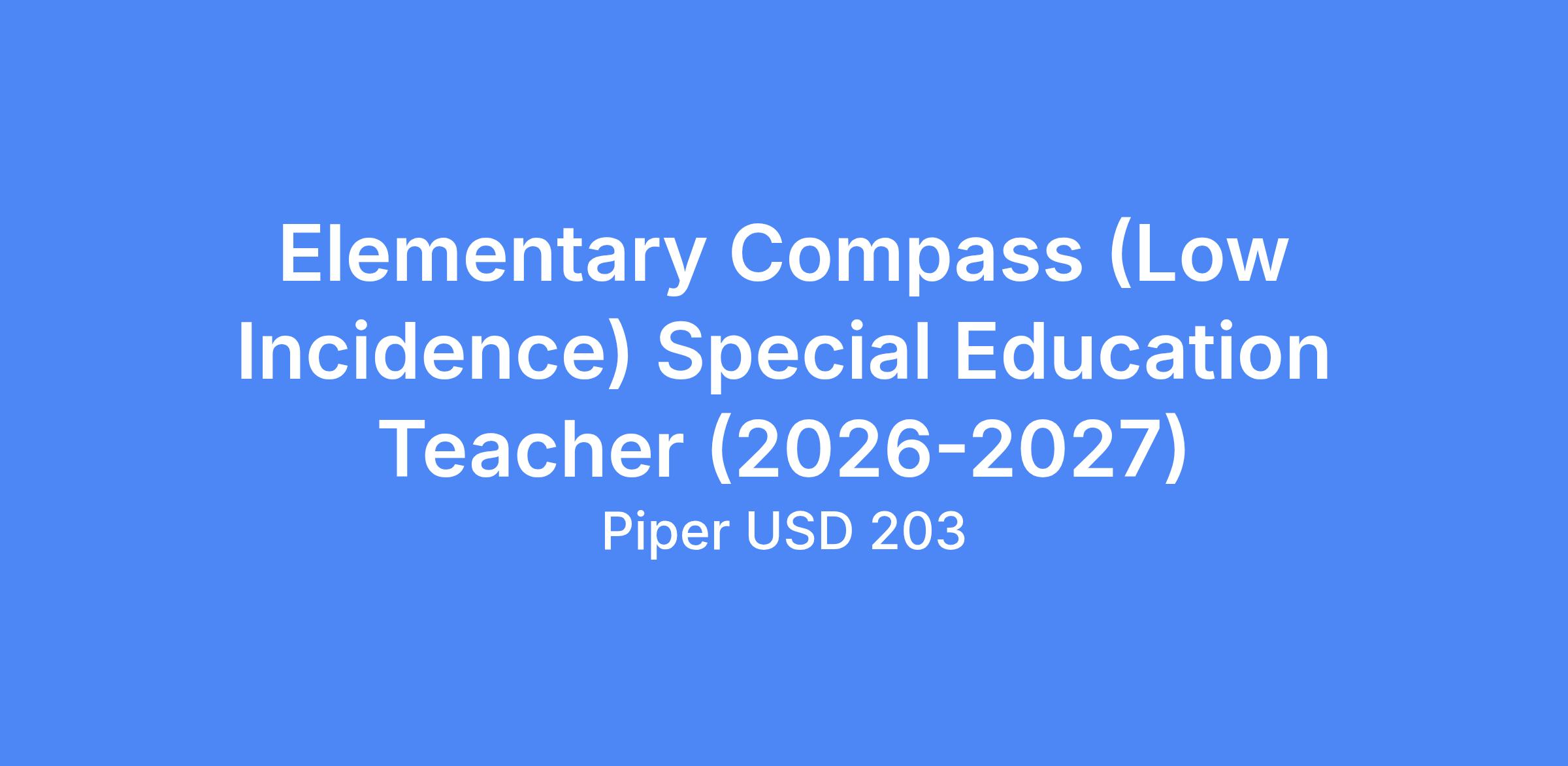 Piper USD 203 has an opening for the 2026-2027 school year for an Elementary Compass (Low Incidence) Special Education Teacher. Position will remain open until filled.