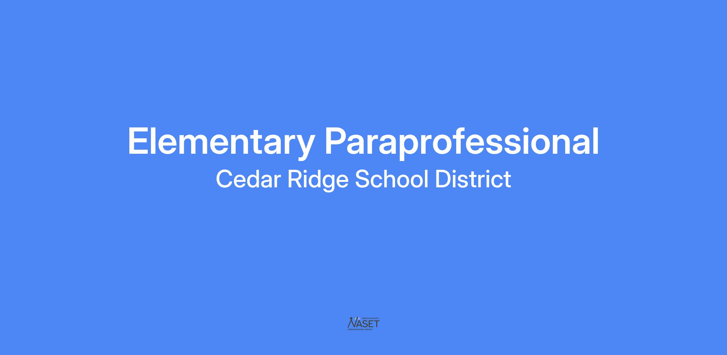 The Cedar Ridge School District is accepting applications for an Elementary Paraprofessional for the 2025-2026 school year. Minimum qualifications: Associates degree or 60 college credit hours OR take and pass the ParaPro Assessment exam. For additional information, please contact Abbi.Limbaugh@Cedarwolves.org. Applications will be accepted until the position is filled.