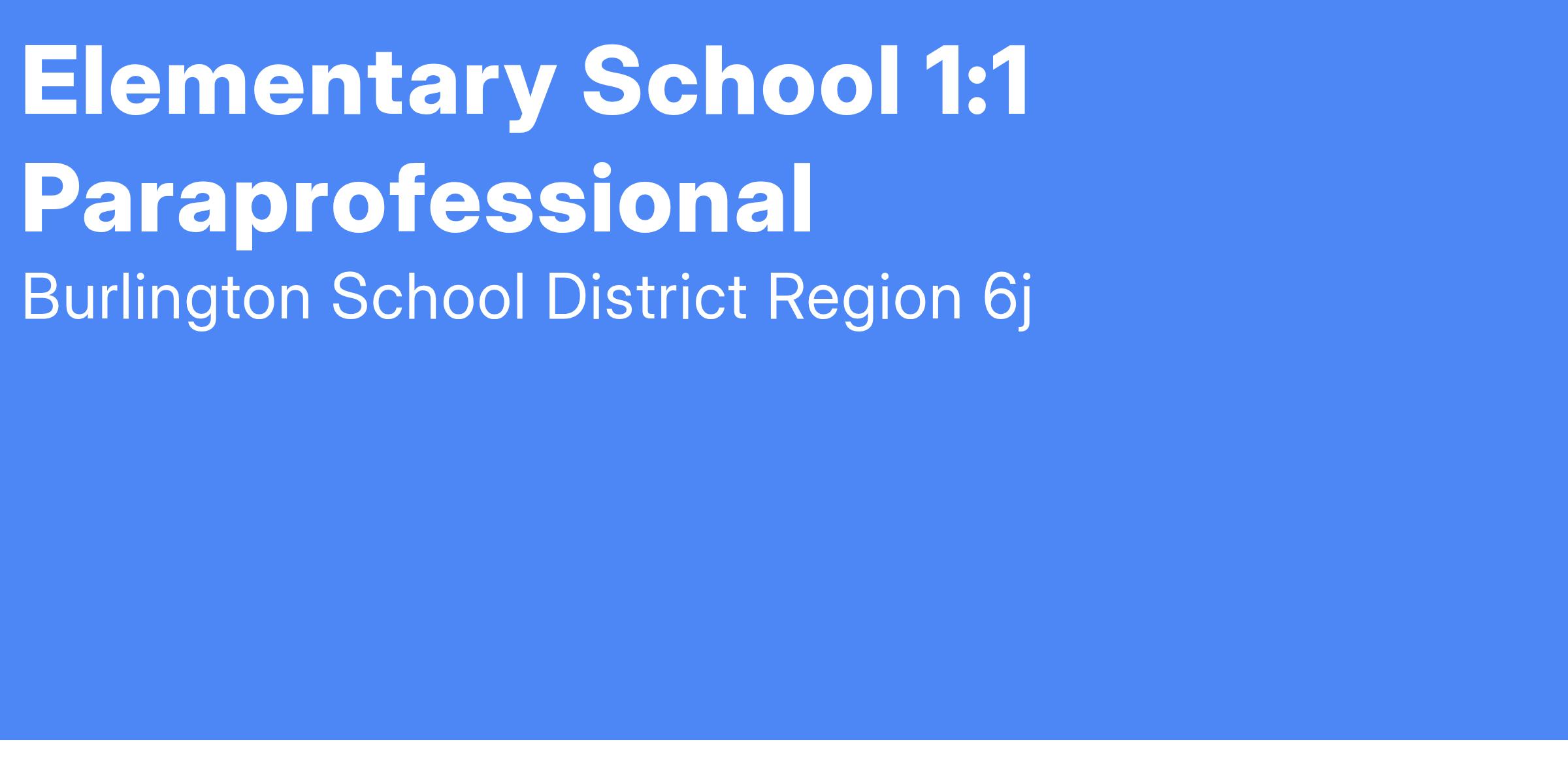 Burlington Elementary School is looking for a Instructional Paraprofessional to work full time Monday - Thursday. Burlington is an amazing place to work, our class sizes are small and our teachers work together to meet the needs of all our students. We value hard work and high standards of excellence. We offer a competitive benefit package including a single health insurance, vision insurance and a life insurance policy fully paid by the district. Salary dependant upon experience.