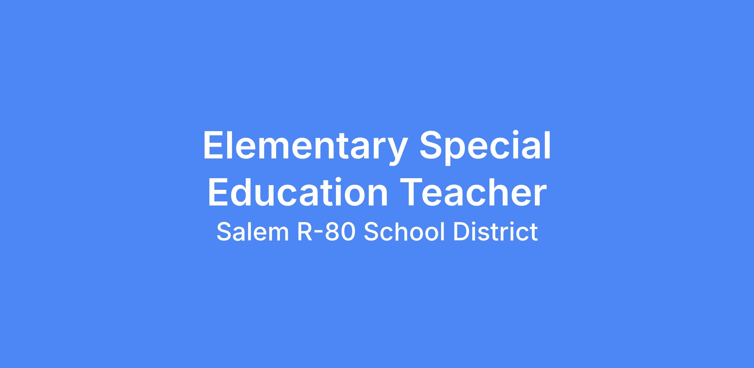 The Salem R80 School District is now accepting applications for an Elementary Special Education teacher for the 2026-2027 school year. Interested applicants should complete an online application. Questions can be directed to Dan Copeland, Assistant Superintendent, 1409 W Rolla Road, Salem, MO 65560, by email at dan.copeland@salemr80.org or by calling (573) 729-6642. The Salem R80 School District currently has a competitive salary and benefits package.