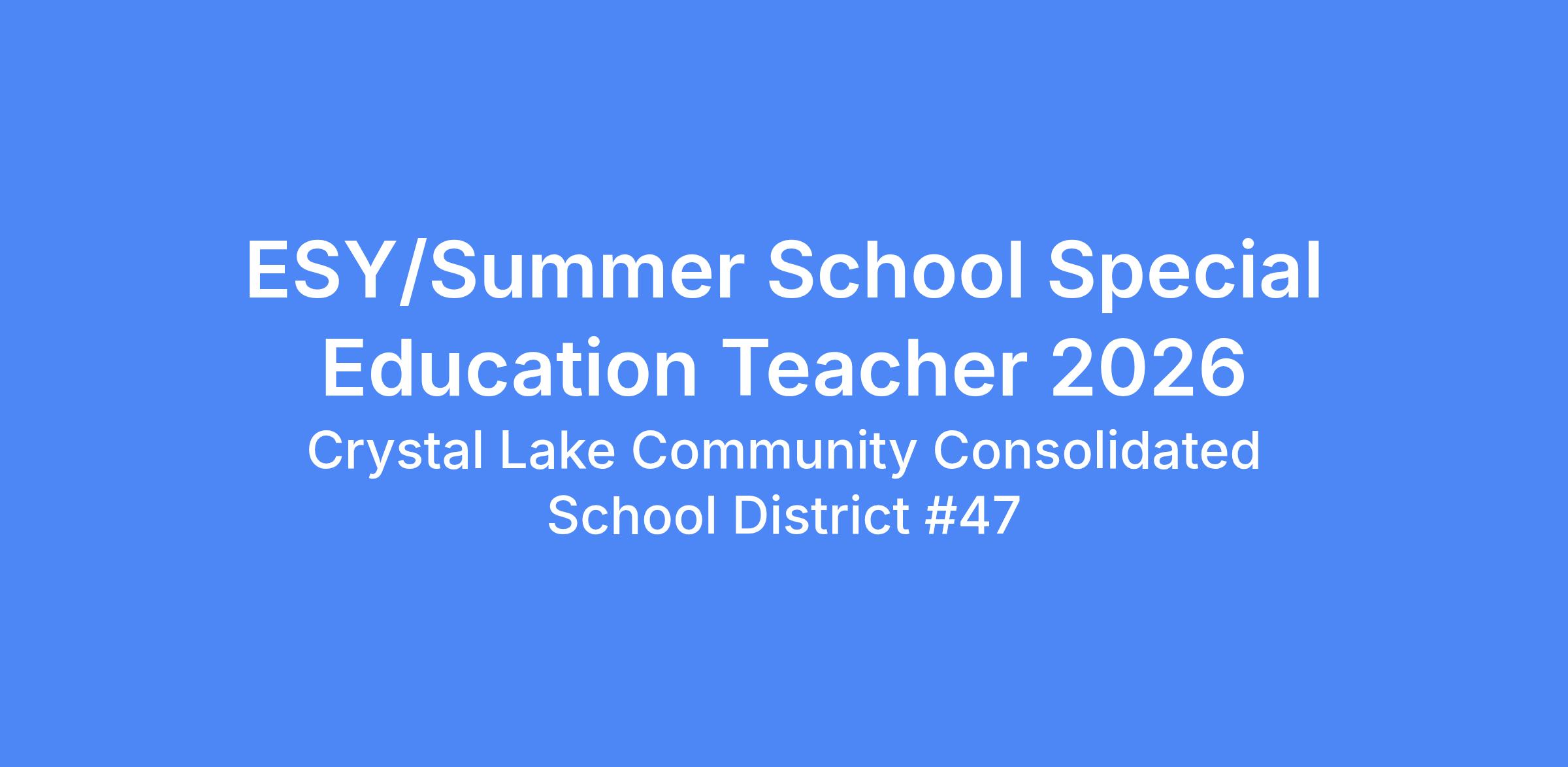 Crystal Lake School District 47 currently has openings for Summer School Special Education Teachers (ESY). The goal of this position is to provide a well-managed classroom environment where students with disabilities have an opportunity to succeed in accordance with their Individual Educational Plan (IEP).