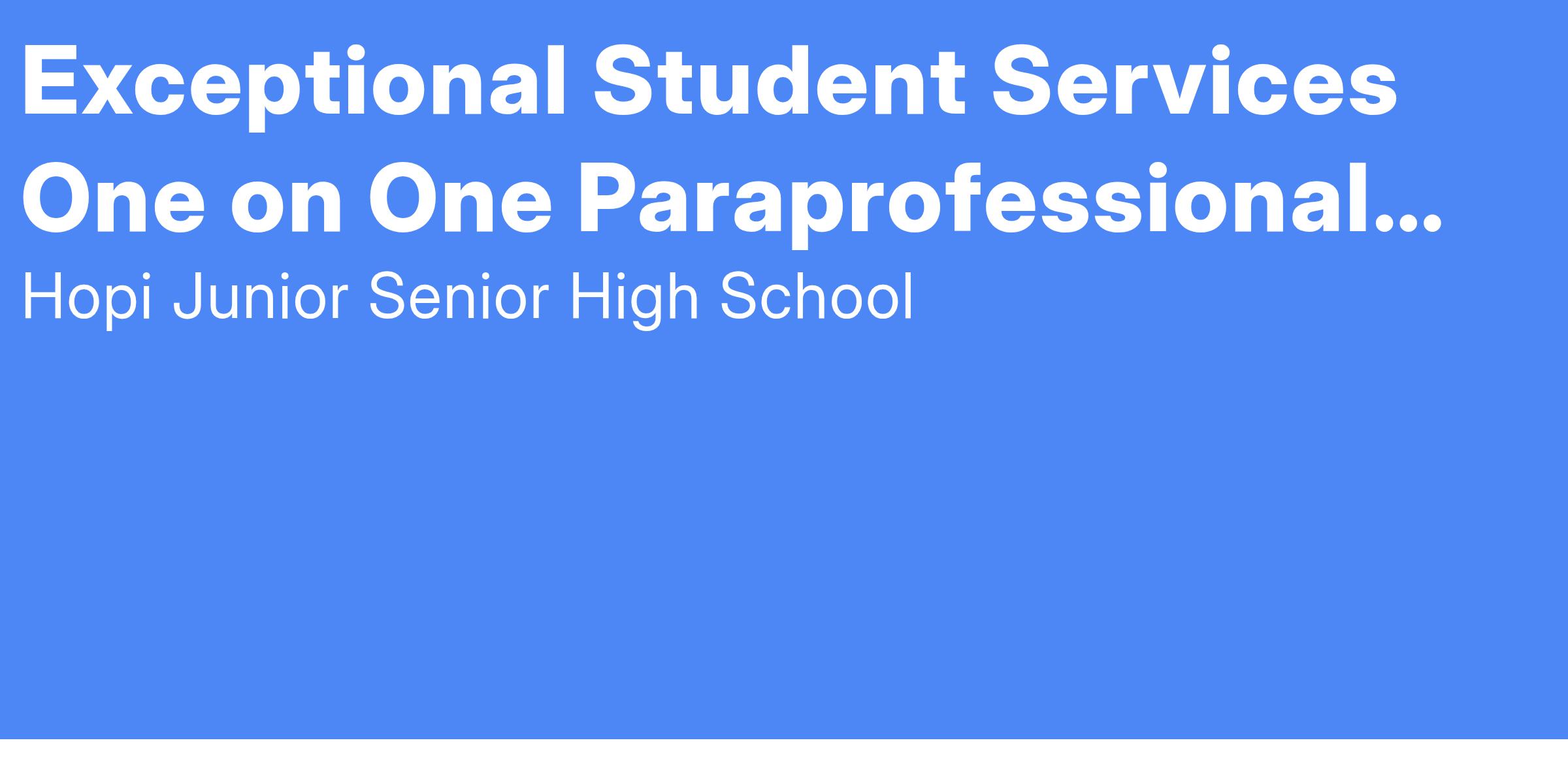 JOB SUMMARY: ESS/One-to-One Paraprofessional who are innovative, enthusiastic and looking for the opportunity to prepare students for a successful future. Hopi Junior/Senior High School is committed to helping all students develop skills in the areas of personal-social growth, educational planning and career and vocational development. The One-to-One Educational Aide in the ESS Department provides personalized support to a student with special needs, ensuring they receive the necessary assistance to access and participate in the educational curriculum. This role involves close collaboration with the special education teacher, general education teachers, and other school staff to support the student’s academic, social, and behavioral development.
