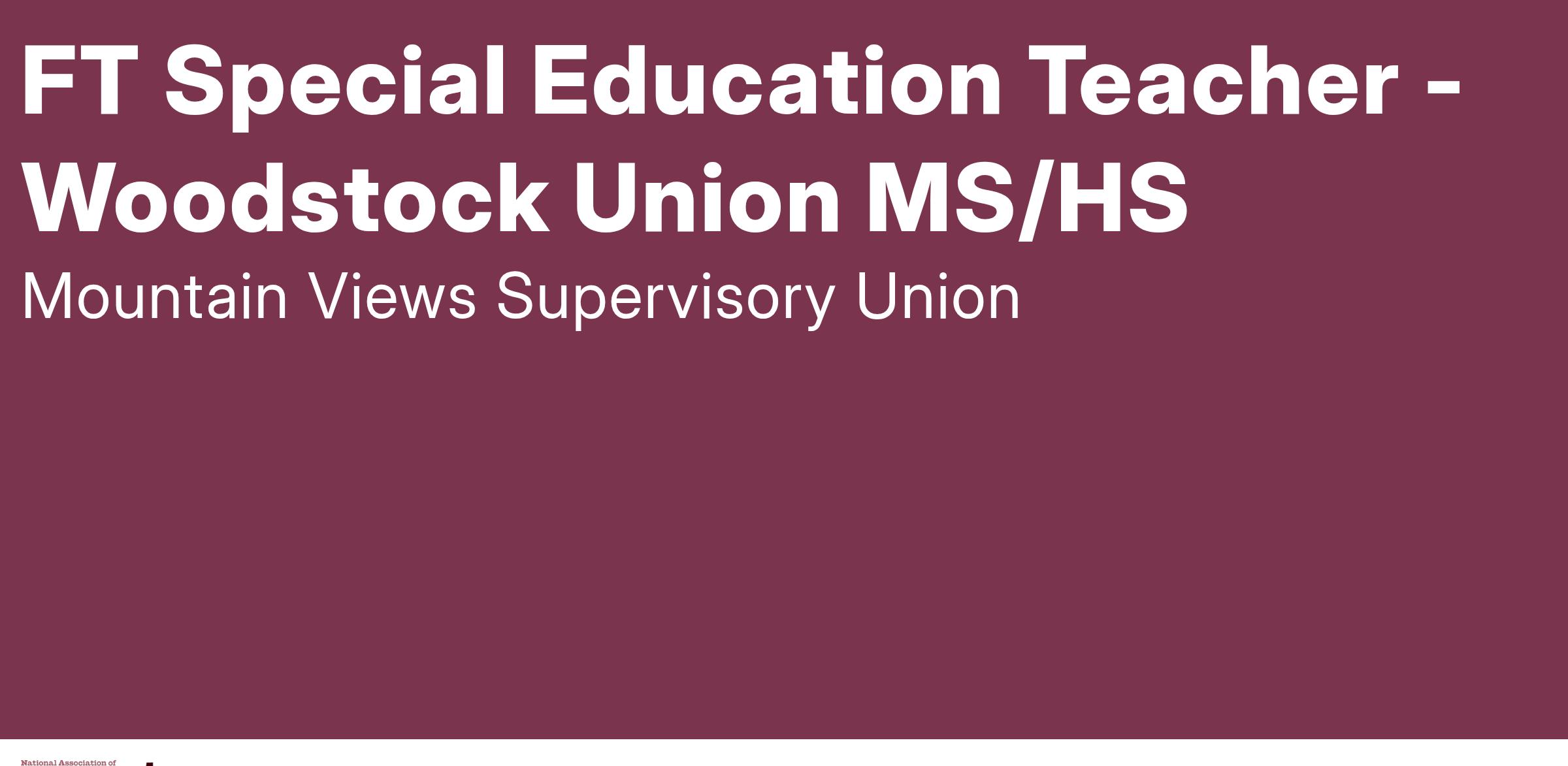 We are seeking a dedicated and passionate Full-Time Special Educator to join our team to provide specialized instruction for students in the Woodstock Union Middle and High School. Being grounded in restorative practices and social-emotional learning; understanding the inextricable relationship between social emotional, behavioral and academic success; and demonstrating a commitment to fostering a supportive and inclusive learning environment where all students will succeed is a must.