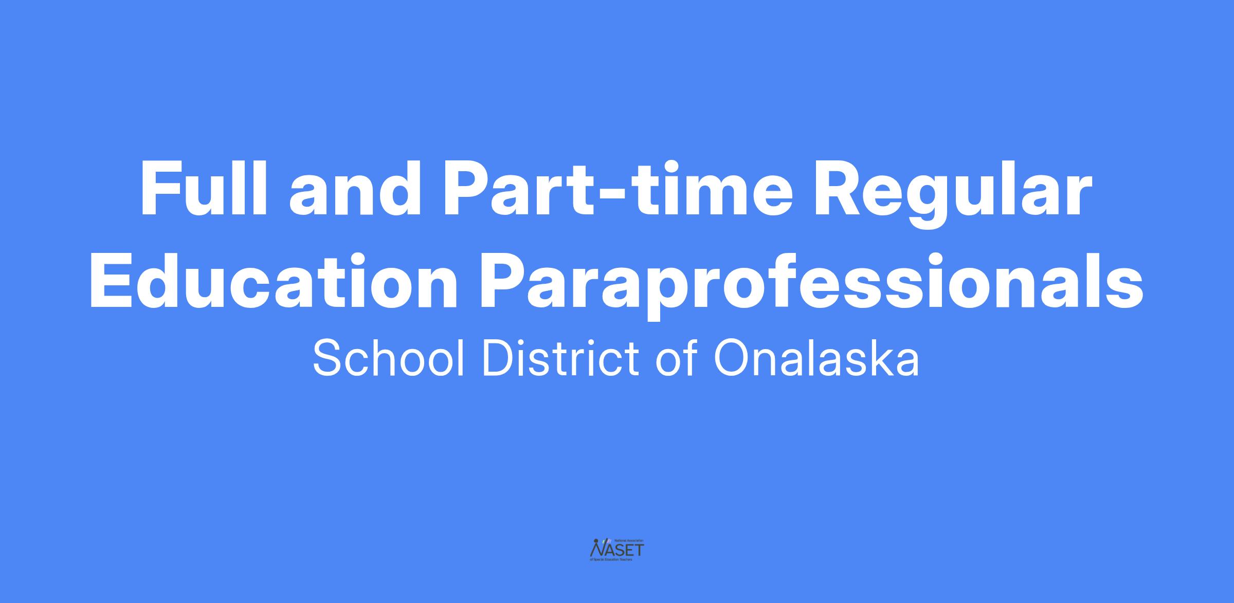 The School District of Onalaska is accepting applications for full and part-time regular education paraprofessionals starting in the 25-26 school year. Paraprofessionals in the School District of Onalaska are classified as one encompassing unit of employees and are an integral part of the school system's programs. Paraprofessionals are assigned by the building administrator to many assignments which may be different in each of the schools; for example, paraprofessionals serve in the instructional areas, classrooms, offices, library and media centers, computer labs, lunchrooms and play areas to support students.