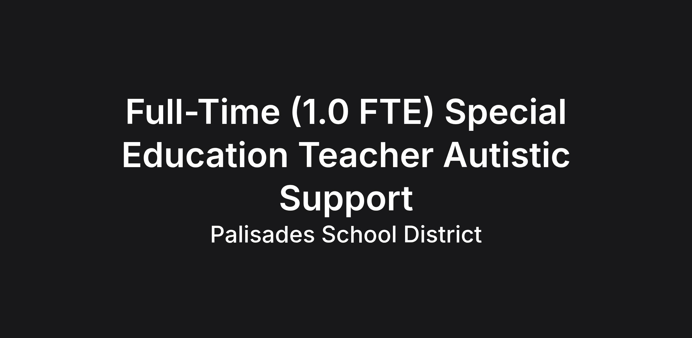The Palisades School District is actively seeking a Special Education Teacher- Autistic Support - to join the district for a contracted position beginning the start of the 2026-2027 school year. Primary responsibilities include working with students in grades K-5, who have autism, communication needs, behavioral needs, needs for self care, and who may require other related services. Prior experience in working with students with autism, supporting communication needs, understanding of applied behavior analysis, and certification in behavior deescalation techniques is preferred.