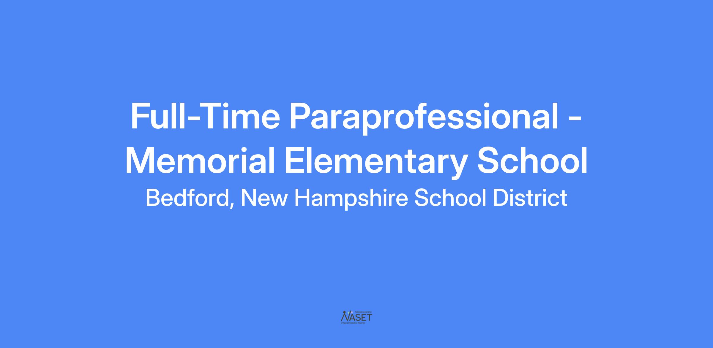 Description: Full time Paraprofessional position, Monday - Friday, 6.5 hours per day at Memorial School.