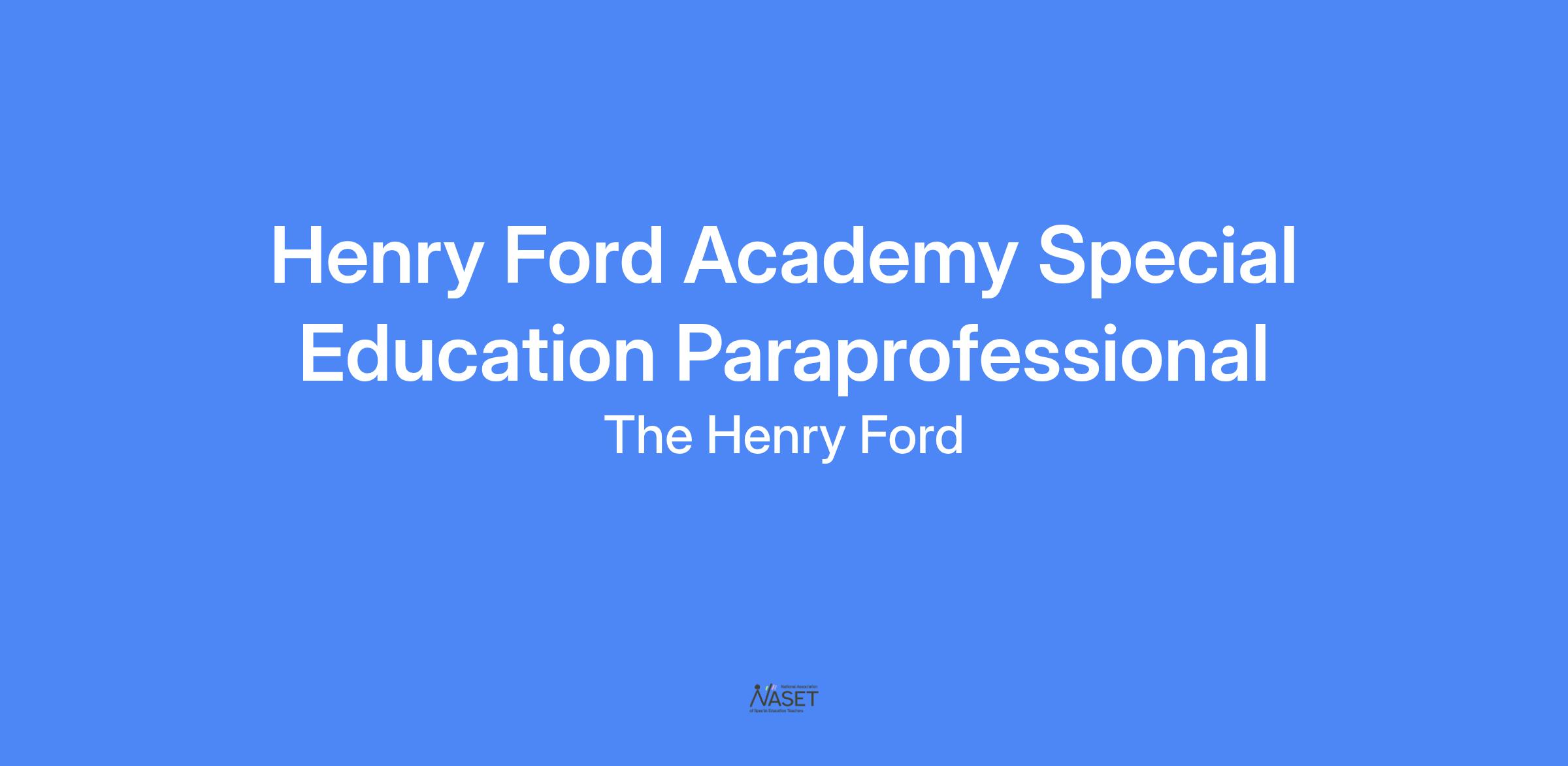 The Special Education Paraprofessional will spend most of their time in classrooms within The Henry Ford Museum and/or Greenfield Village, interacting with students and staff, in addition to maintaining a positive school atmosphere. Henry Ford Academy - Dearborn is an equal opportunity employer and encourages candidates from diverse backgrounds to apply.