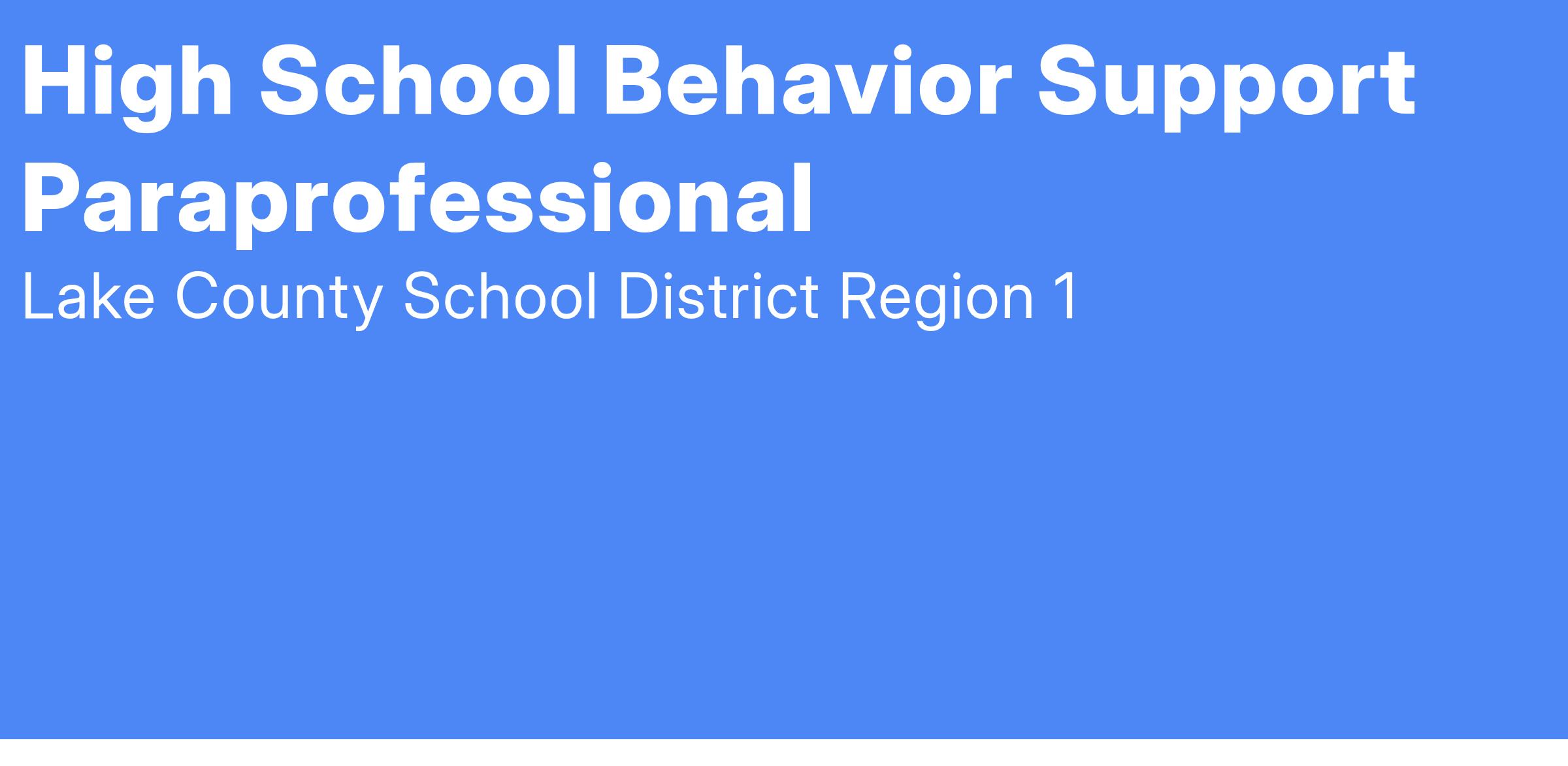Provide support to our Lake County High School students, teachers, families, and administrators to help improve our building wide culture. The primary purpose of the Behavior Paraprofessional is to be proactive and reactive to Tier 1 and 2 behaviors. This position will primarily work with 7th and 8th grade and will have involvement with 9th - 12th grade as needed.