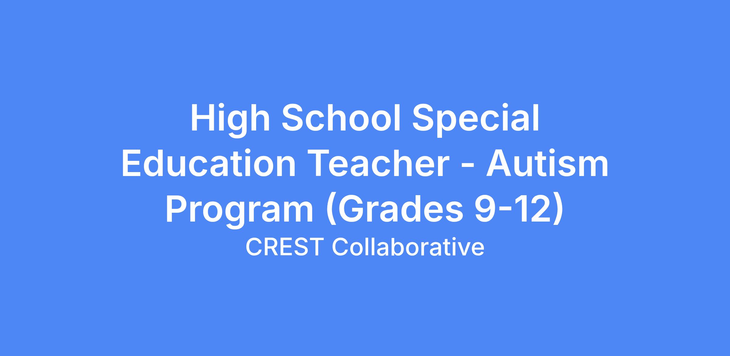 CREST is looking for a Special Education Teacher to teach students in our 9-12 Autism program. This classroom is in one of our cohorts in Lifeworks; vocational, hybrid, academic, or life skills. Licensure in Moderate Disabilities 9-12 is required. Appropriate experience with students with Autism, Intellectual and Emotional disabilities at this grade level is preferred and licensure in Mild/Moderate Disabilities 9-12 is required.