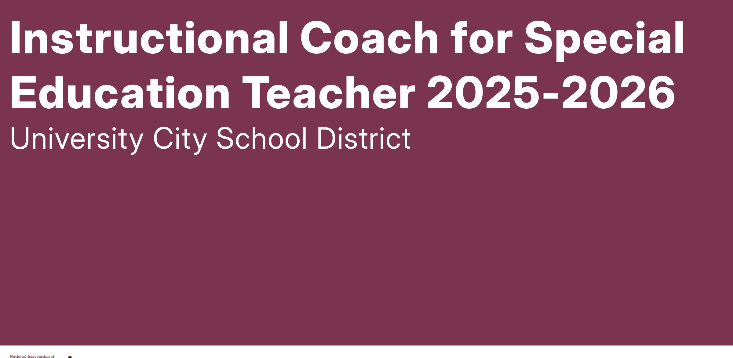 The School District of University City is accepting applications for an Instructional Coach for Special Education Teacher. The overall role of the instructional support leader will be to support the work of the classroom teacher through coaching, feedback, modeling, data analysis, and planning. The Instructional Coach will also assist with developing and implementing interventions for small groups of students. This position will support classroom teachers with the implementation of research-based practices by providing coaching support to improve academic and social-emotional outcomes and reduce overall disproportionality.