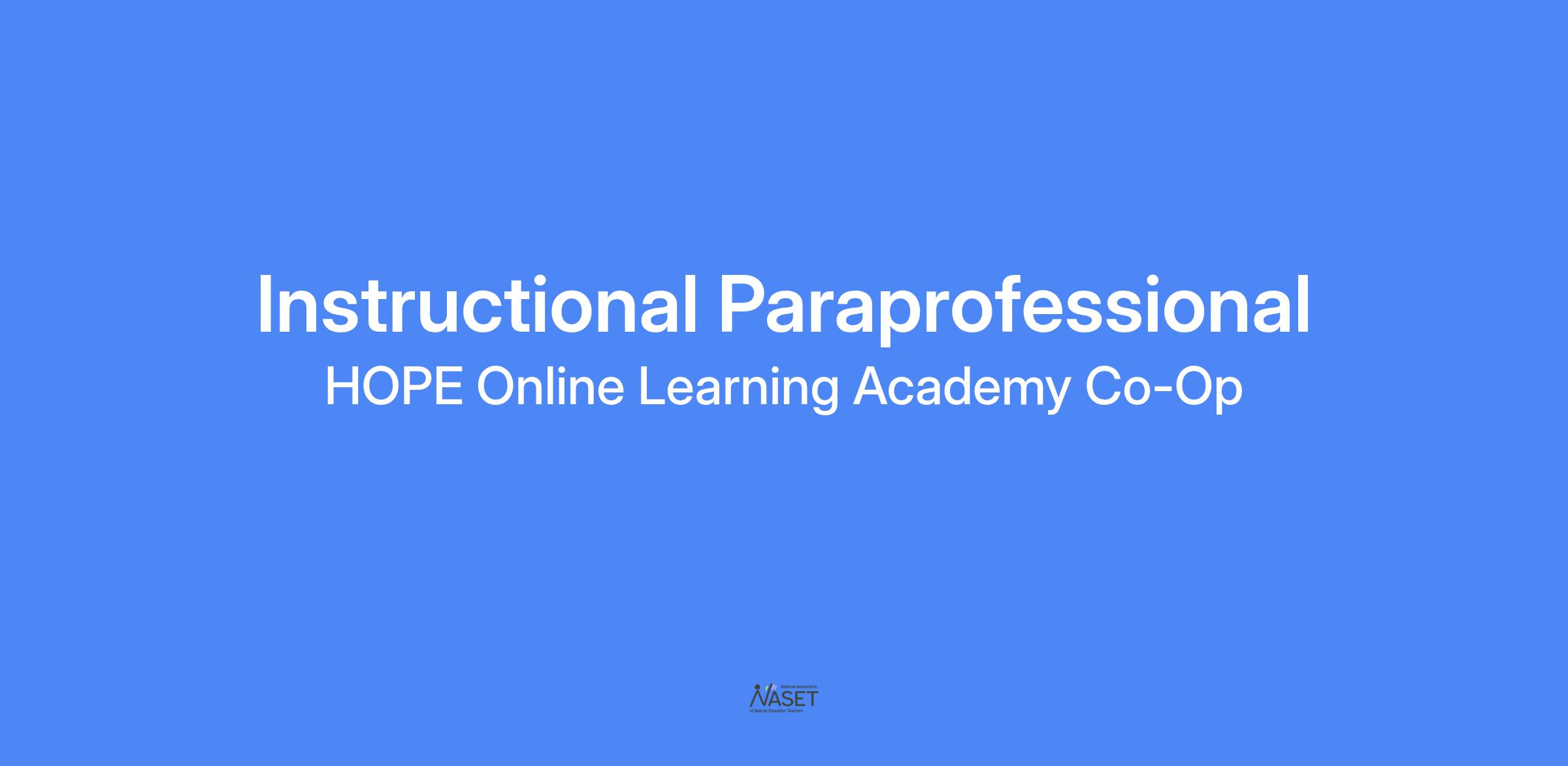 HOPE Online Learning Academy Job Description Instructional Paraprofessional JOB CLASSIFICATION / WORK EXPECTATIONS SALARY RANGE: $30,000-$38,000 ($17 - $22/hour) The Instructional Paraprofessional position is a full time, non-exempt position. Employees in this position follow the Academic Year Work Calendar, as determined annually. The expected work week is 40 hours, from Monday - Friday. Part time positions may also fall under this job description, at salary commensurate with FTE. This job description may not be inclusive of all assigned duties, responsibilities or aspects of the job described and may be amended at any time at the discretion of HOPE’s management. SUMMARY: The Instructional Paraprofessional will work with students in the classroom and in small groups under the supervision of a licensed specialist. The Para will deliver intervention lessons, progress monitor, and reteach as needed to ensure student successful completion of the task. The Para works closely with SPED, ELD, general education, and students in the MTSS process, and supports other students as needed and appropriate. ESSENTIAL DUTIES AND RESPONSIBILITIES: Priority Area: Instructional Support 65% Duties and Responsibilities ? Provide differentiated support to address the needs of EL, SPED and general education students as directed, manage resources, and collaborate on intervention processes. ? Demonstrate knowledge of HOPE Online curriculum as well as intervention programs. ? Ensure that all students have access to and receive appropriate instruction to meet grade-level content and language standards and to address academic gaps as assigned. ? Use strategies to actively engage students during instruction. ? Implement an intervention program with fidelity adhering to time, grouping, and lesson plans to accelerate student learning. ? Gain proficiency in administering and supporting learning sites in the administration of HOPE Online required assessments (AIMSWEB, iReady, CMAS, ACCESS, SAT/PSAT) and Edgenuity performance tasks. ? Provide support in implementation of Tier 2 individual student plans (Read, ELL, IEPs, RtI/MTSS). ? Responsible for providing individual and/or small group instructional strategies to students with special needs under the supervision of licensed staff. ? Make independent decisions within appropriate parameters; implementing team designed behavior support plans; monitoring and supporting students during special activities, preparing and modifying instructional materials; collecting data for IEP goals and behavior plans. ? Monitoring and providing feedback on student progress, maintaining student confidentiality and adapting to changes in responsibilities and schedules. Priority Area: Communication and collaboration with various stakeholders to provide a positive, safe, and engaging learning environment 25% Duties and Responsibilities ? Support students under the supervision of a professionally licensed specialist. ? Attend all learning site and HOPE faculty/staff meetings and PD as appropriate. ? Work directly with the licensed specialists (weekly meetings required). ? Develop and maintain collaborative, positive, effective relationships with all stakeholders. ? Coordinate with all stakeholders (Learning Site Staff, Site Coordinator, Virtual Instructor, family, etc.) to Instructional Paraprofessional Job Description - 5/2023 Page 1