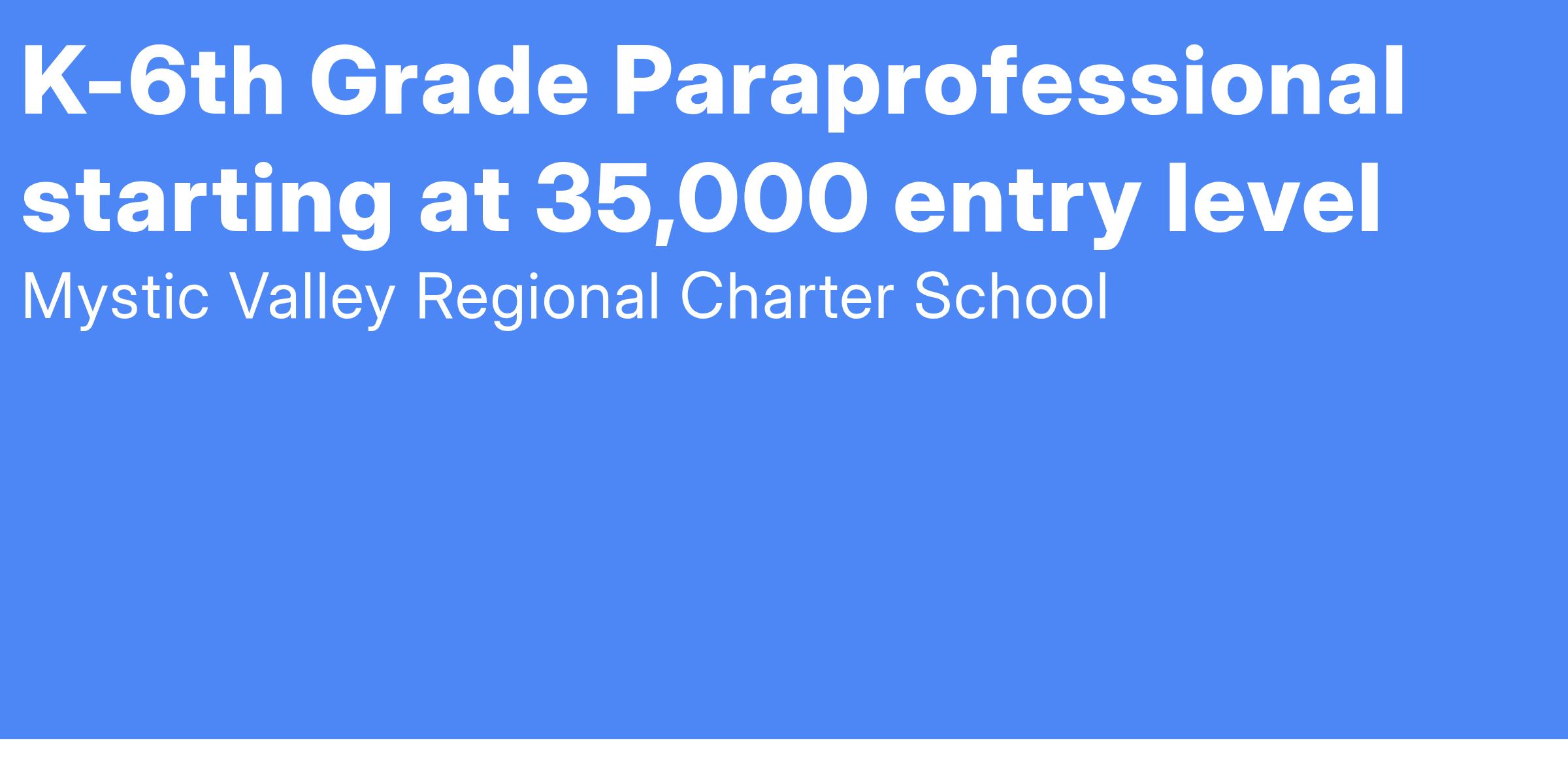 Mystic Valley Regional Charter School is seeking a dedicated and dynamic Paraprofessional to join our academic team. This individual will play a vital role in supporting student learning and fostering a positive, productive classroom environment. Under the direction of a classroom teacher for instructional responsibilities and an Assistant Director for non-instructional tasks, the Paraprofessional helps ensure students remain engaged, on task, and progressing academically.