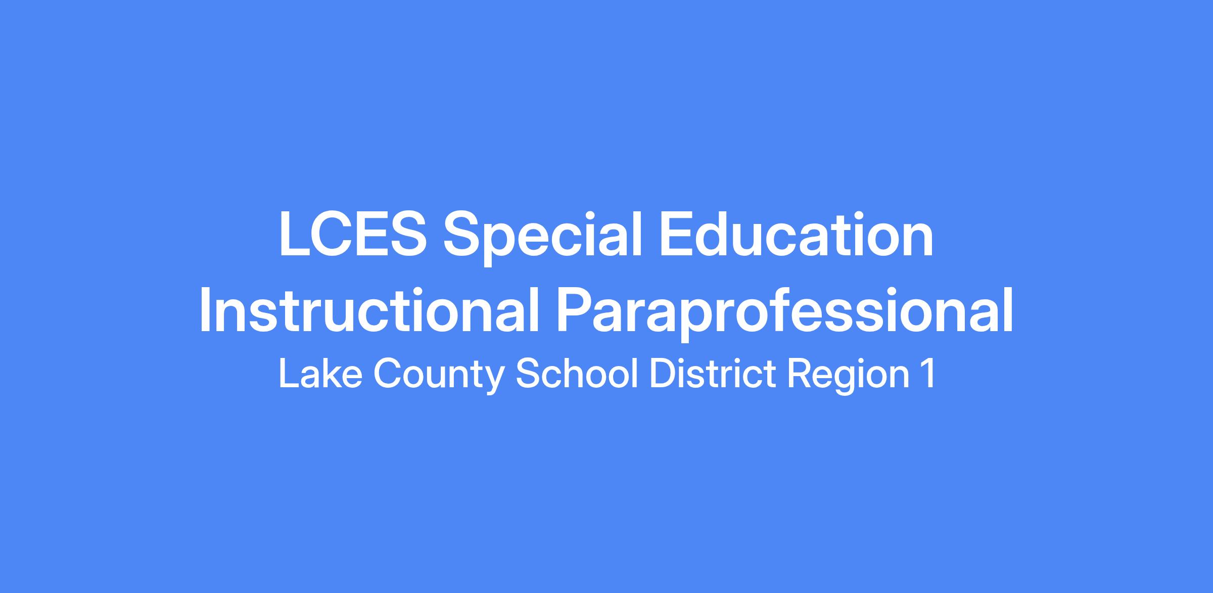A Special Education Paraprofessional, in collaboration with and under the direction of the Special Education Teacher/case manager, provides a variety of emotional, behavioral, and instructional support to students with mild to significant support needs. Employee acts as a teacher resource working directly with students to support instruction, provide accommodations as stated in students' Individual Education Program (IEP), and facilitate learning by engaging with children as they participate in early school experiences. This Paraprofessional must work cooperatively and professionally with team members to ensure strong communication as they implement recommended interventions with fidelity. This position is an integral part of creating an environment that will facilitate successful learning for students with special education needs as Lake County School District seeks to provide an equal opportunity for education to all students.