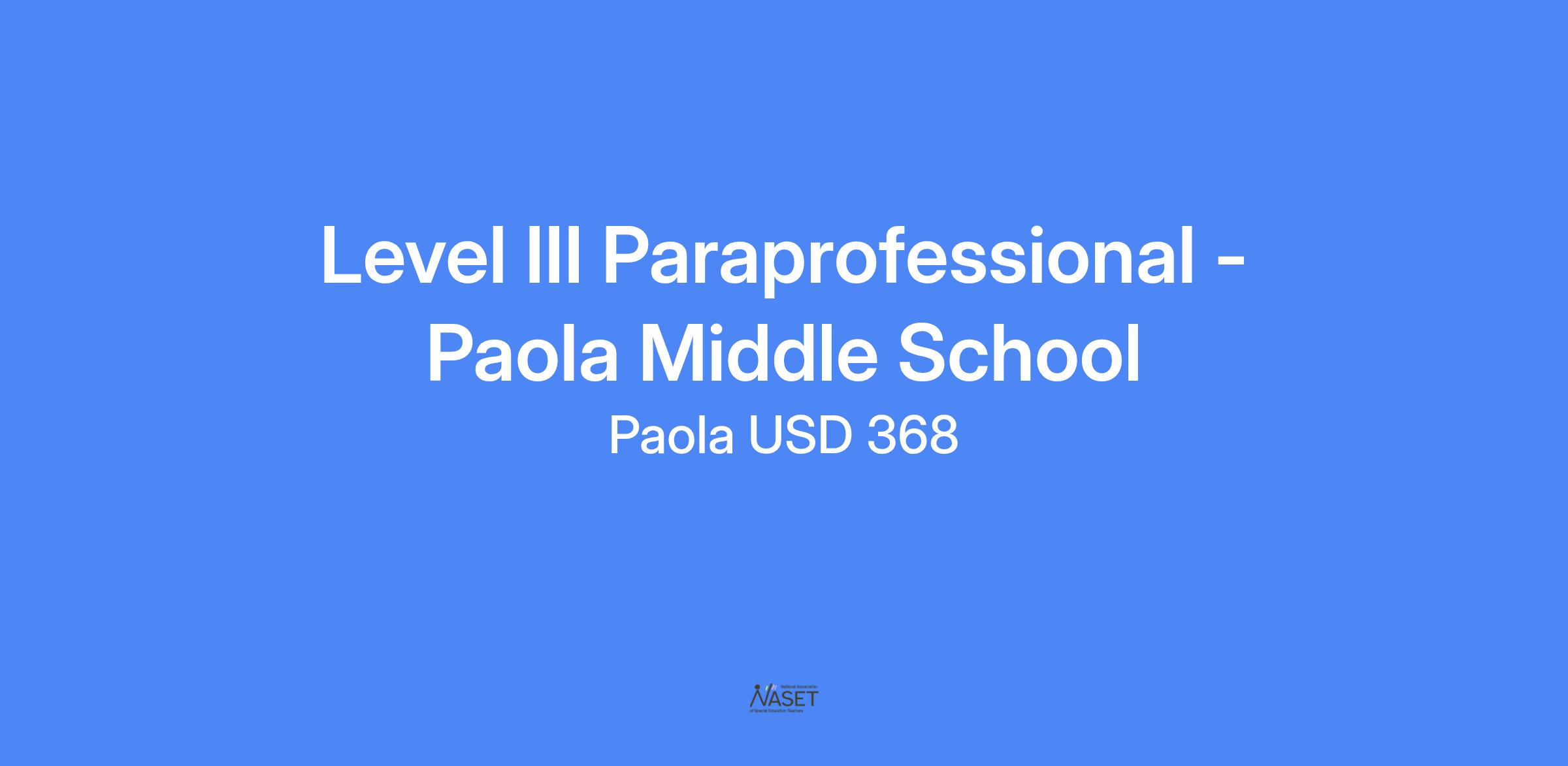 USD 368 is seeking applicants for special education paraprofessionals to work in the Level III Program at Paola Middle School. This position serves 6th through 8th grade, Special Education students in a self contained classroom setting.