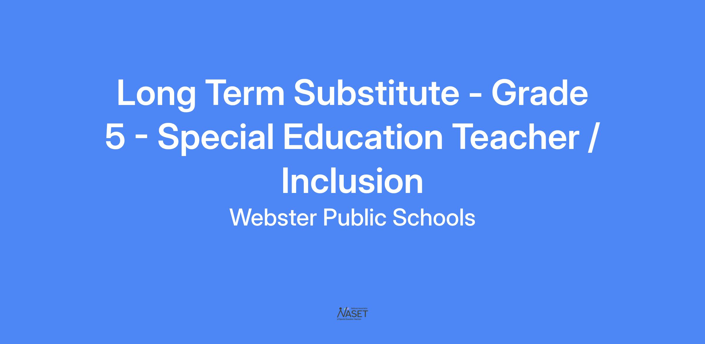 Webster Public Schools is seeking qualified candidates for the anticipated position of a Long Term Substitute Grade 5 Special Education Teacher / Inclusion at Webster Middle School. This LTS position will be from 8/25/25 to anticipated 01/05/26. PERFORMANCE RESPONSIBILITIES: 1. Plan and implement instruction to insure that all students meet and exceed Common Core Standards and State Frameworks 2. Use of data to inform instruction, to track student progress and to track progress of self through self-evaluation and goal setting 3. Deliver engaging, targeted instruction that meets MA DESE and Common Core Standards for level and subject taught 4. Differentiate services and instruction to meet variety of student learning needs and strengths 5. Maintain active communication with students’ families in support of their learning and to communicate with families consistently and regularly throughout the school year about their children’s academic and social progress 6. Assess student performance using formal, summative, and portfolio assessments to drive instruction 7. Perform other duties as assigned by the principal